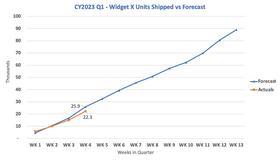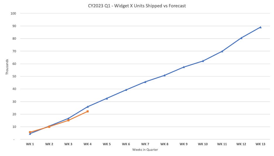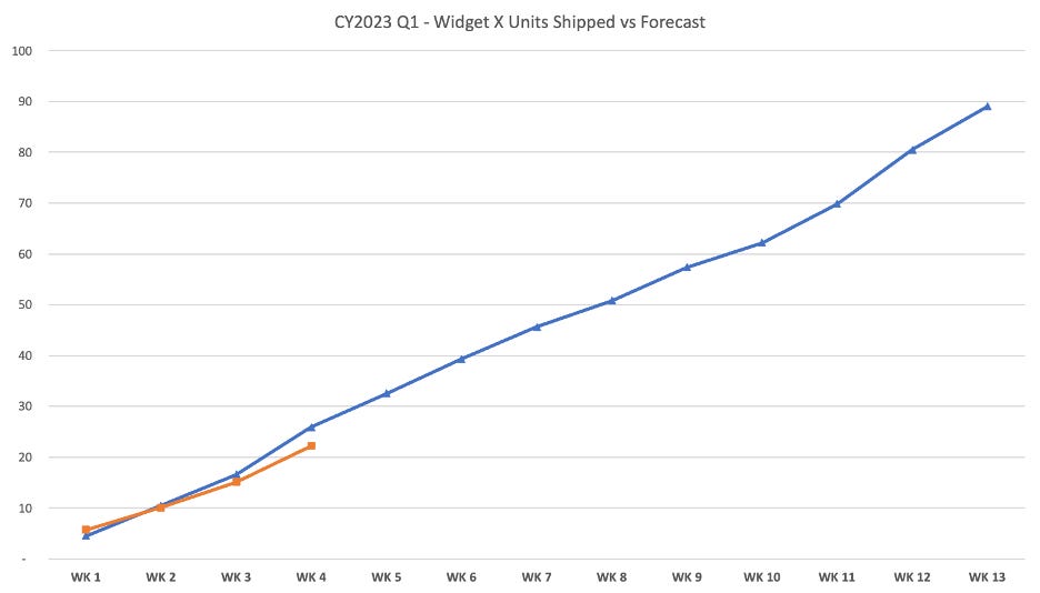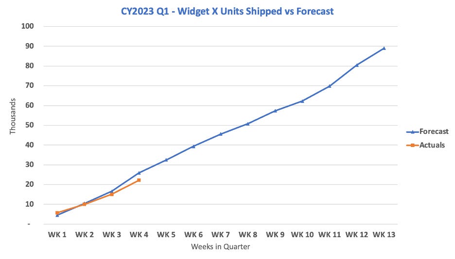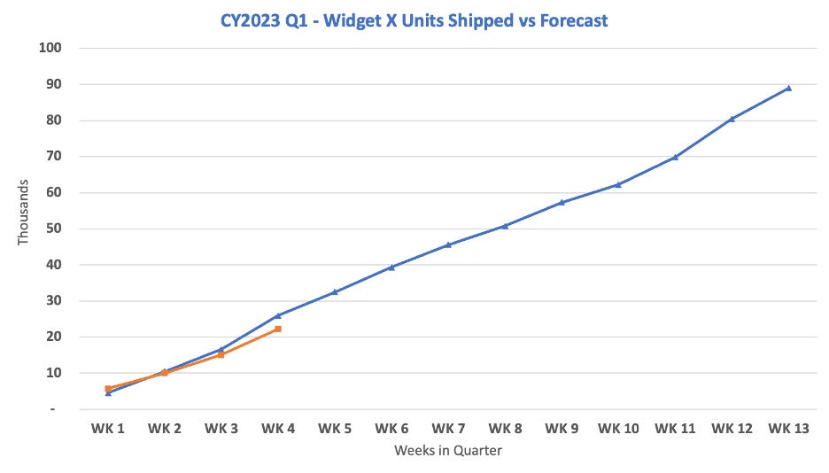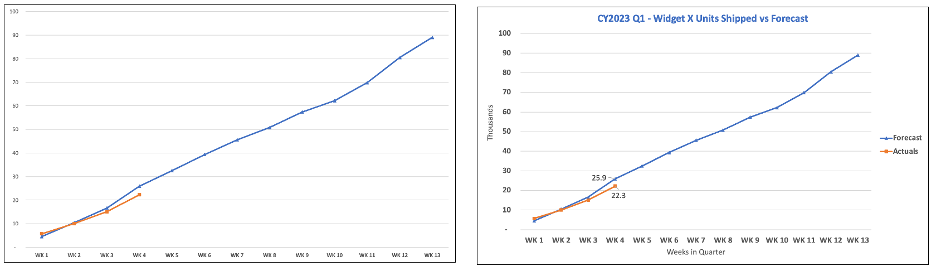 OK – this is a bit better because now I clearly know what this chart is about. It’s about how many units we’ve shipped against the forecast. Looks like we’ve shipped around 21 or 22 versus a forecast of 25 or so assuming we’re on week 4. It’s pretty obvious that the X-axis is Weeks (WK 1, WK 2, etc) – but what is the Y-Axis? Is it really units?