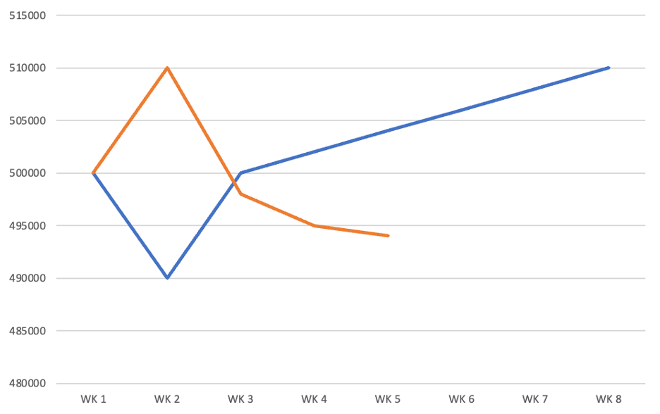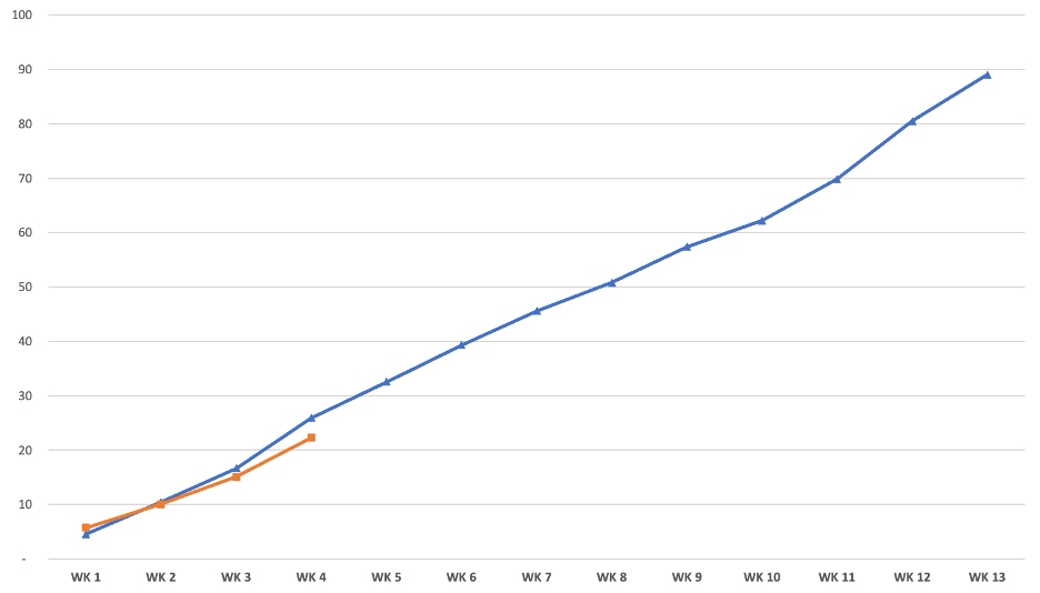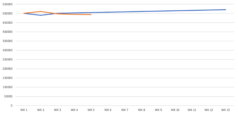 I’m going to divert from this chart for a moment to show an example of how changing the y-axis can provide very misleading numbers. This is very similar to a chart I saw today. At first glance (assuming the orange is actuals – but again there was no label) my first thought was “uh oh” – this is really bad. We started strong, but heading in the wrong direction and in for a huge miss.
