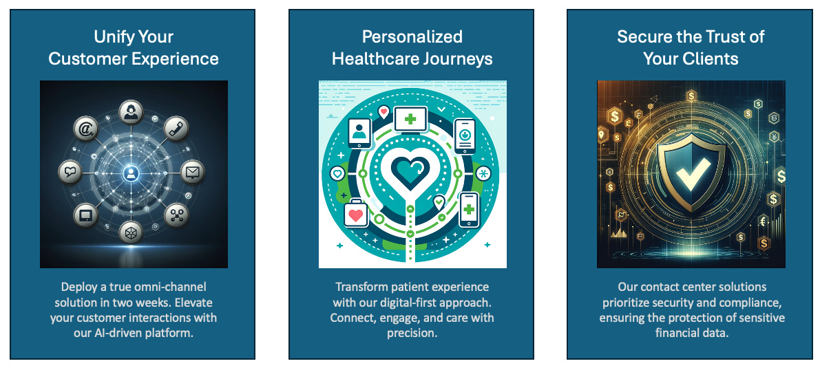 “We’re a new startup with an innovative contact center offering that has better CX than any of the existing competitors, has the most advanced AI capabilities to provide a true omni-channel solution, and allows it to be deployed into any environment in two weeks. We want to target CEOs, CFOs and CROs in the financial services and healthcare industries. We want to test a bunch of different advertising campaigns. Can you create 10 different short ad campaigns we could put in an online ad and create a graphic for each one as well?”
