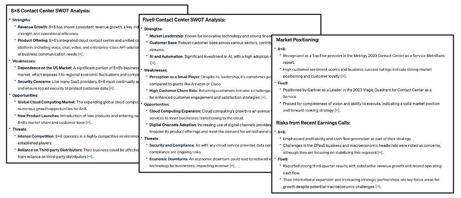 “Please do a detailed competitive analysis of 8x8's contact center offering in comparison to Five9's contact center offering. Do a full SWOT breakdown of each product. Discuss market positioning and any risks to their business models from recent earnings calls.”