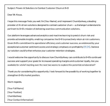 “I want to reach out to the CFO of 8x8 about our new AI product that can help them dramatically reduce churn. Our company is called ChurnGoAway. Please find his name and based on what you know through the SWOT analysis and what a CFO does, please create a draft email for me that has compelling talking points that I could use to introduce my company and ask for a meeting.”