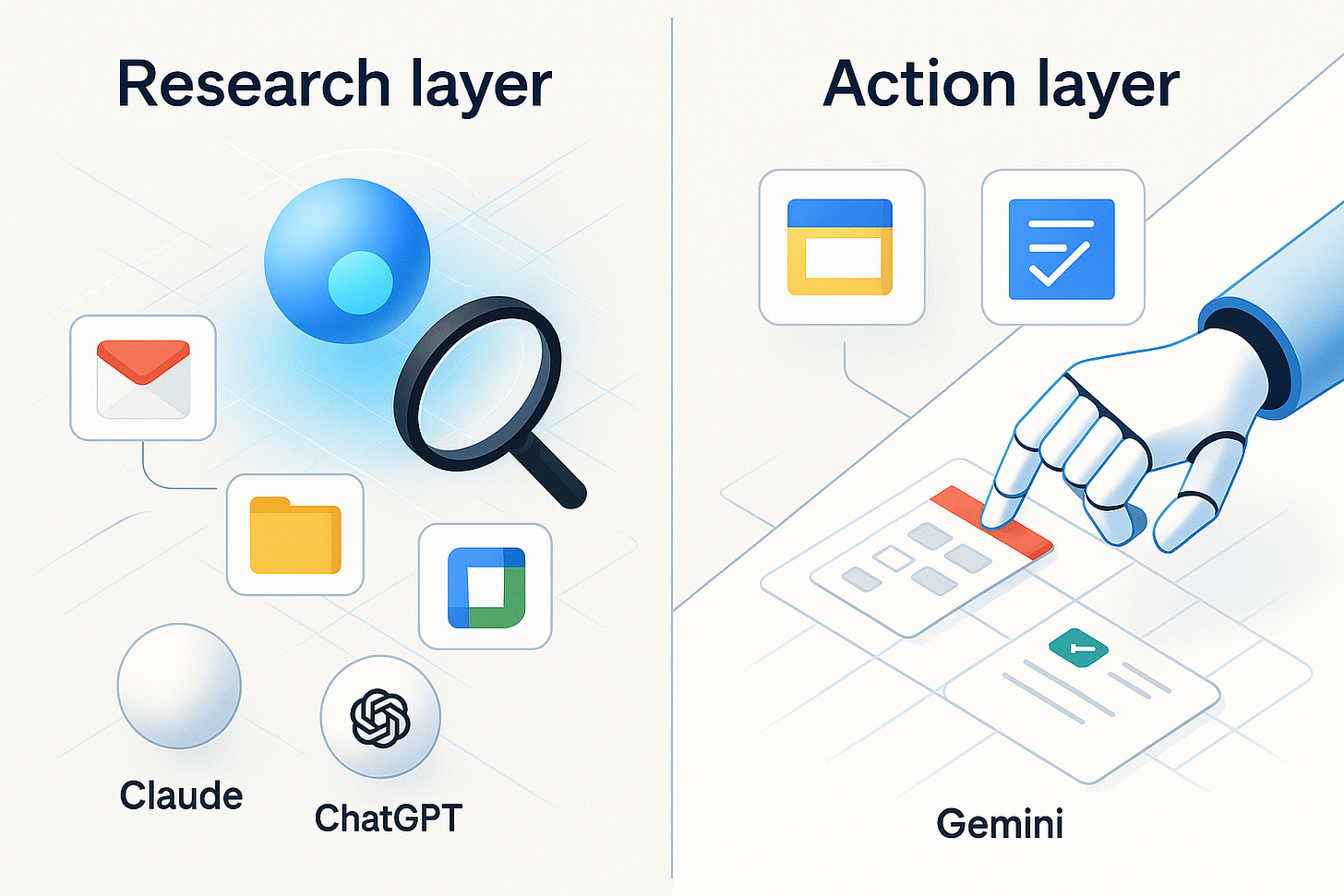 Claude and ChatGPT read your Google world. Gemini acts in it.