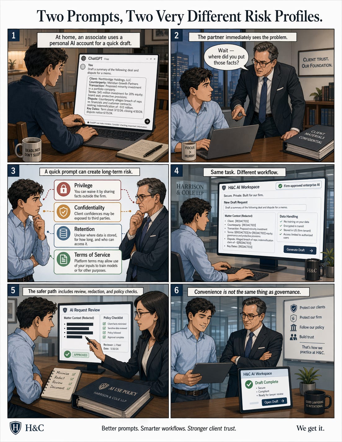 Prompt: “Create a one-page, 6-panel editorial training comic for lawyers titled “Two Prompts, Two Very Different Risk Profiles.” Storyline: Panel 1 associate pastes sensitive client facts into a personal consumer AI account at home; Panel 2 partner notices and looks alarmed; Panel 3 freeze-frame with callouts: privilege, confidentiality, retention, terms of service; Panel 4 the same associate uses the firm-approved enterprise workflow instead; Panel 5 secure review process with redacted facts, policy checklist, and approval steps; Panel 6 ending panel with the caption “Convenience is not the same thing as governance.” Style: sophisticated editorial comic, law-firm setting, readable captions, consistent characters, modern and serious with a light touch of wit, no goofy cartoon energy.”