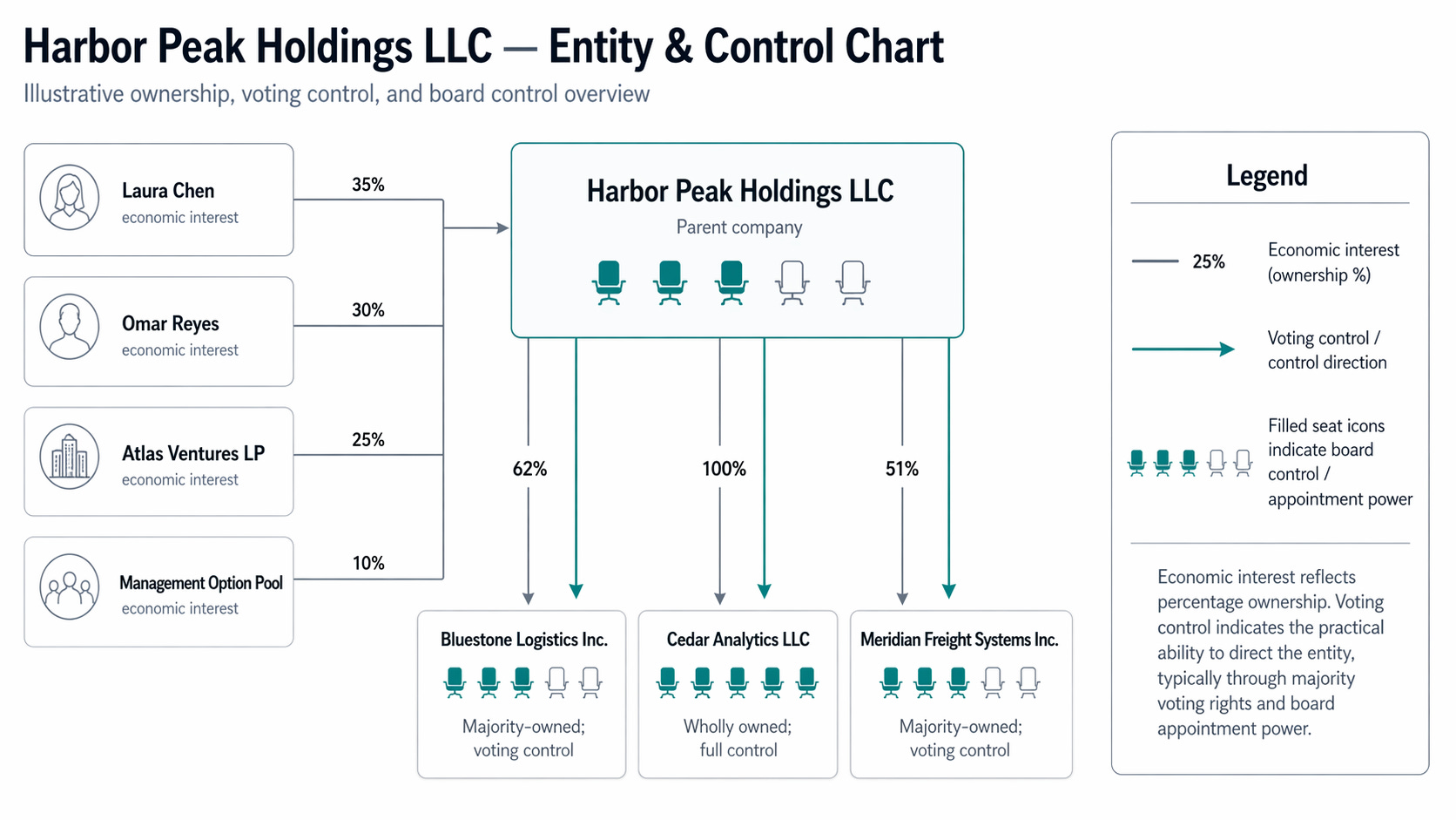 Prompt: “Create a beautifully clear entity and control chart for a fictional private-company dispute. Parent company: Harbor Peak Holdings LLC. Subsidiaries: Bluestone Logistics Inc. (62%), Cedar Analytics LLC (100%), Meridian Freight Systems Inc. (51%). Individual owners of Harbor Peak: Laura Chen 35%, Omar Reyes 30%, Atlas Ventures LP 25%, management option pool 10%. Show ownership percentages, control arrows, board-seat icons, and a right-side legend explaining voting control vs. economic interest. Use a premium M&A-slide aesthetic: white background, crisp small text, thin connector lines, subtle slate and teal accents, beautifully organized boxes, zero clutter, fully presentation-ready.”