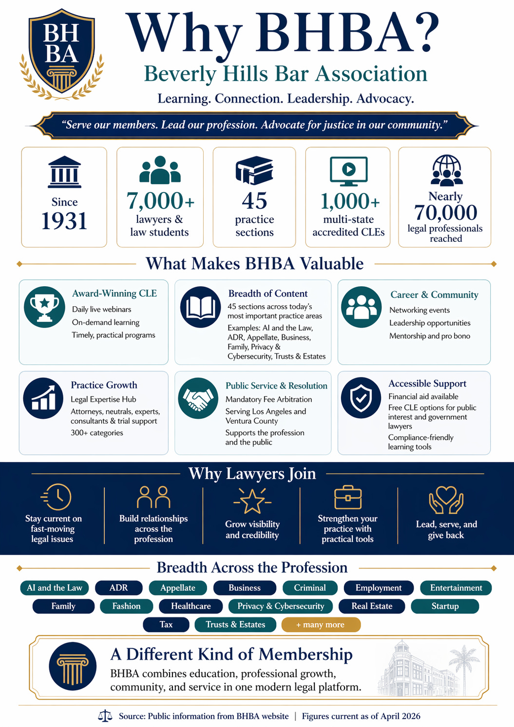 Prompt: “Go research the Beverly Hills Bar Association (BHBA). Create a compelling infographic that they can use in marketing materials that highlights the value the bring, the breadth of content, the capabilities, reasons to join, and more.”