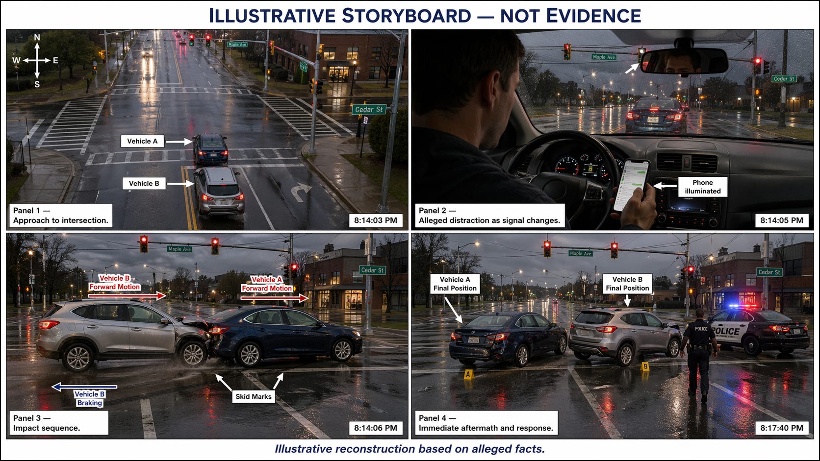 Prompt: “Create a 4-panel litigation demonstrative storyboard for a fictional rear-end collision at a rain-slick intersection, clearly labeled as an illustration and not evidence. Panel 1: wide overhead view of the intersection with street names and signal lights; Panel 2: driver looking down at a phone as the light turns red; Panel 3: impact sequence with motion arrows and skid marks, non-graphic and neutral; Panel 4: immediate aftermath with police arrival and vehicle positions. Keep the same cars, weather, lighting, and street geometry across all panels. Add small captions, time stamps, directional arrows, and a footer that says “Illustrative reconstruction based on alleged facts.” Style: realistic courtroom demonstrative, sober and precise, not sensational. Photorealistic.”
