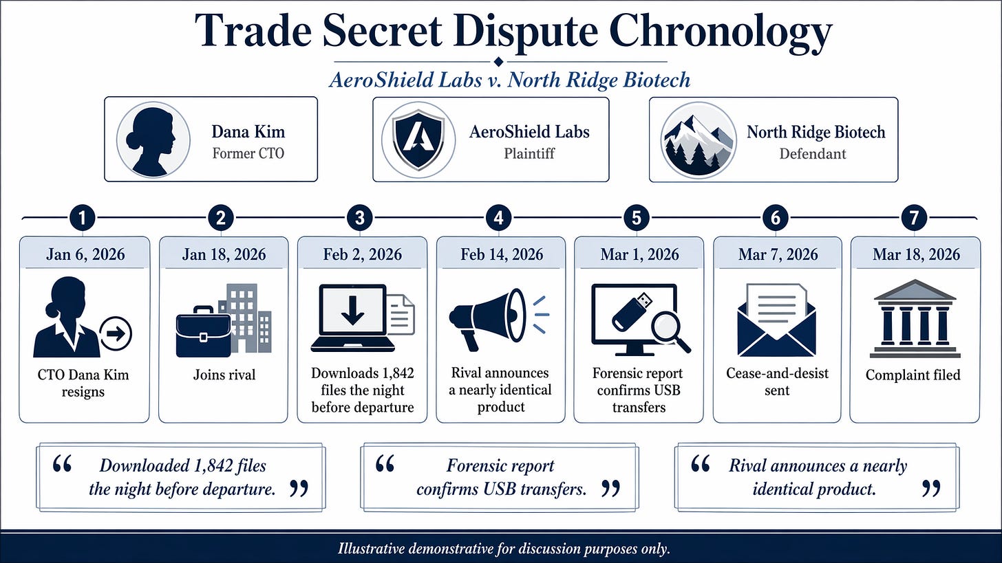 Prompt: “Create a premium litigation chronology board for a fictional trade secret dispute between AeroShield Labs and North Ridge Biotech. Facts to visualize: Jan 6, 2026 CTO Dana Kim resigns; Jan 18 joins rival; Feb 2 downloads 1,842 files the night before departure; Feb 14 rival announces a nearly identical product; Mar 1 forensic report confirms USB transfers; Mar 7 cease-and-desist sent; Mar 18 complaint filed. Design a clean 16:9 legal demonstrative with a left-to-right timeline, event cards, short captions, elegant icons, three key-player portraits or silhouettes, and three exhibit-style pull quotes. Style: elite law-firm mediation board, restrained navy/gray palette, crisp readable typography, white background, serious and polished. Add footer text: “Illustrative demonstrative for discussion purposes only.” Do not invent extra facts.”