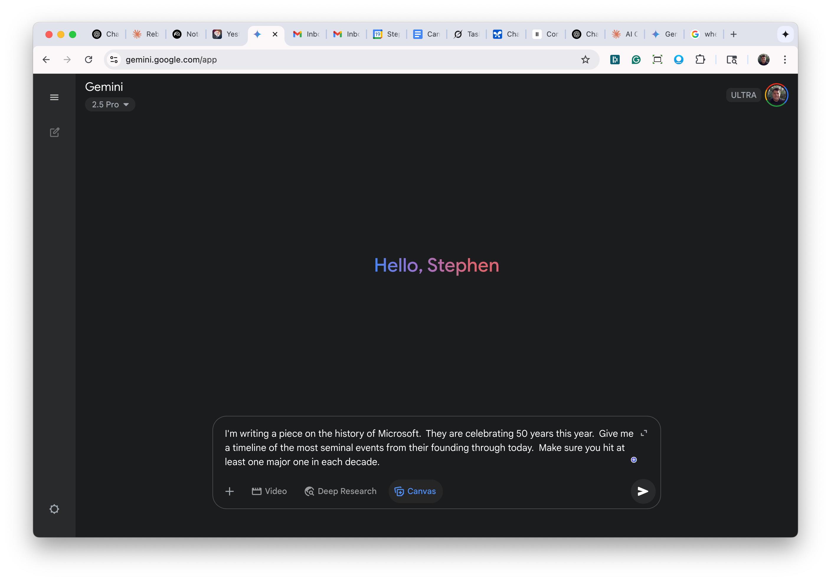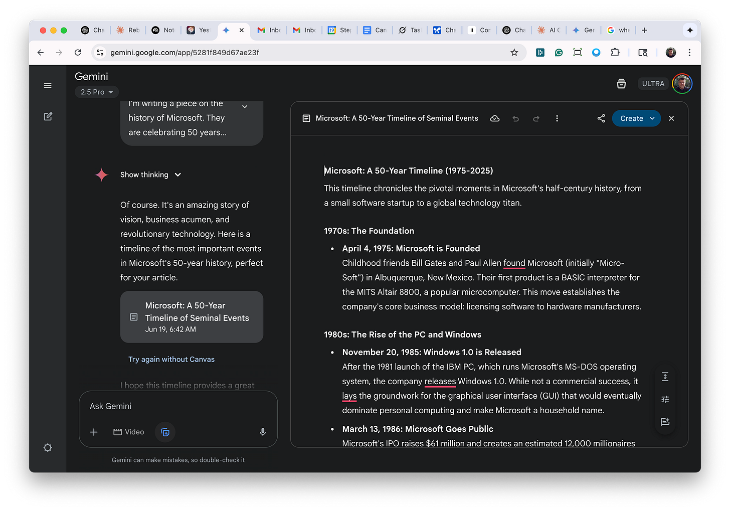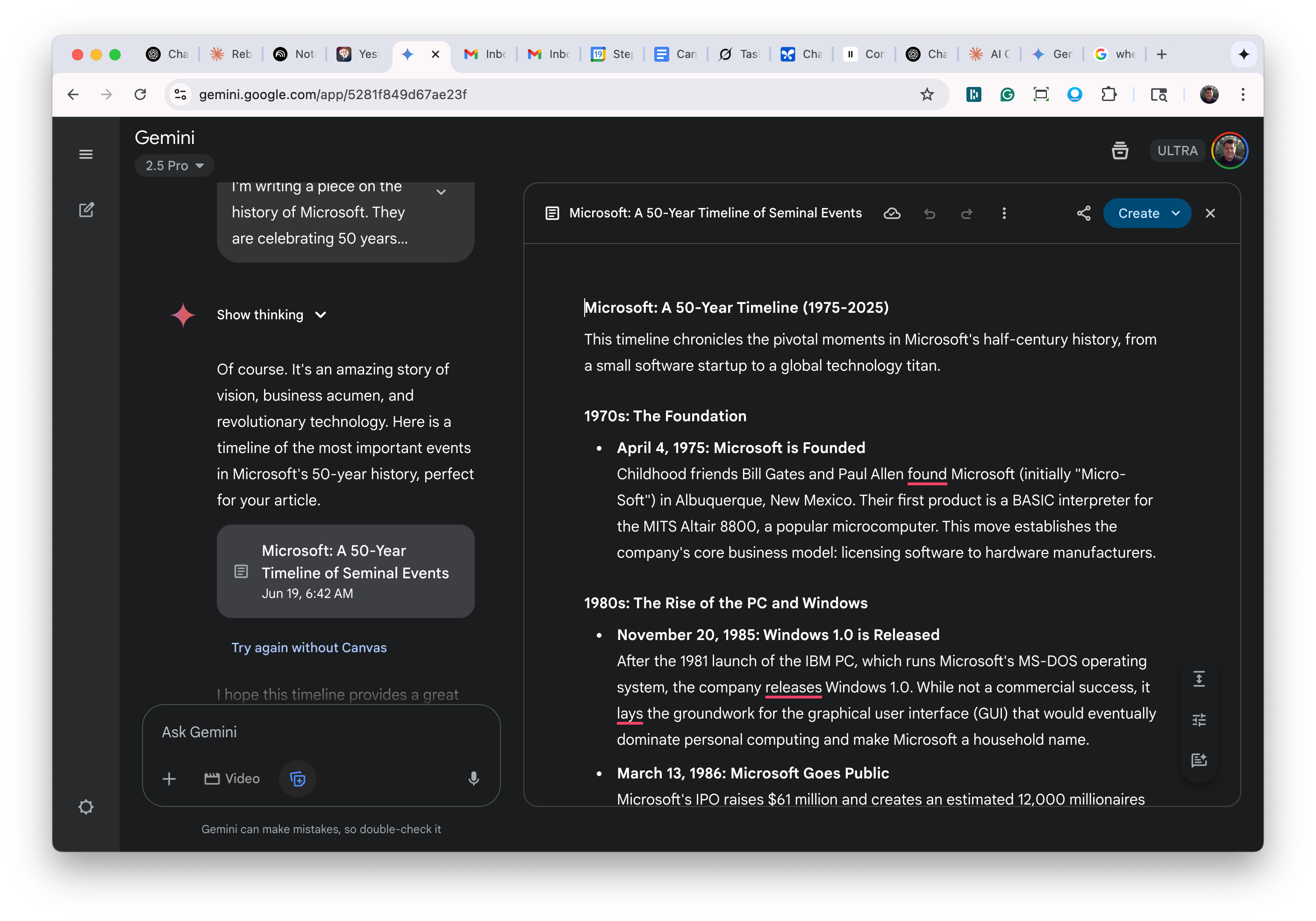 Let me show you how it works. Microsoft recently celebrated its 50-year anniversary this year (an amazing milestone!). Let's say I was writing a piece on the 50-year history, and I wanted to cover the significant milestones in their evolution. I would start by going into Gemini and typing in a prompt like this: "I'm writing a piece on the history of Microsoft. They are celebrating 50 years this year. Give me a timeline of the most seminal events from their founding through today. Make sure you hit at least one major one in each decade." Before hitting "enter" to submit the prompt, I would also click on the canvas window.