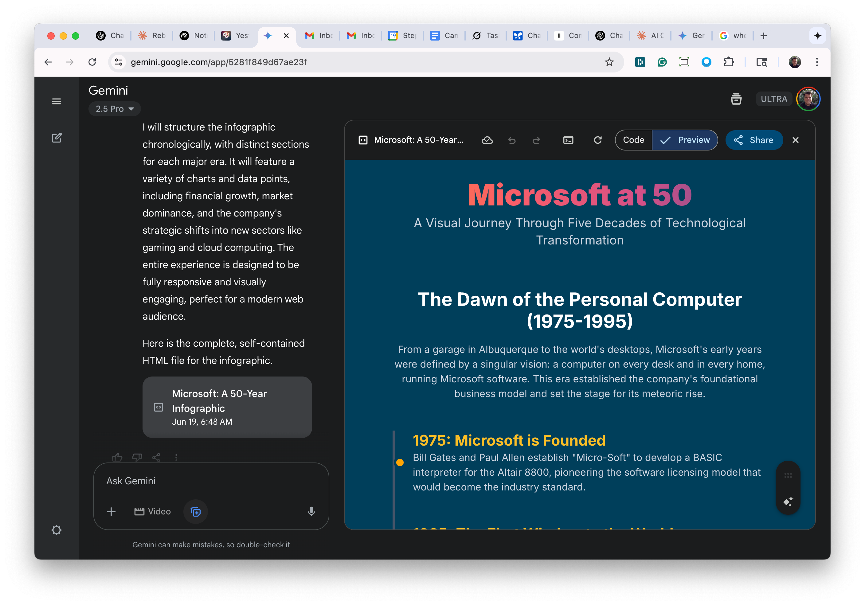What you'll get back a few seconds later is a first draft of the 50-year history in the canvas window. It should look something like this: