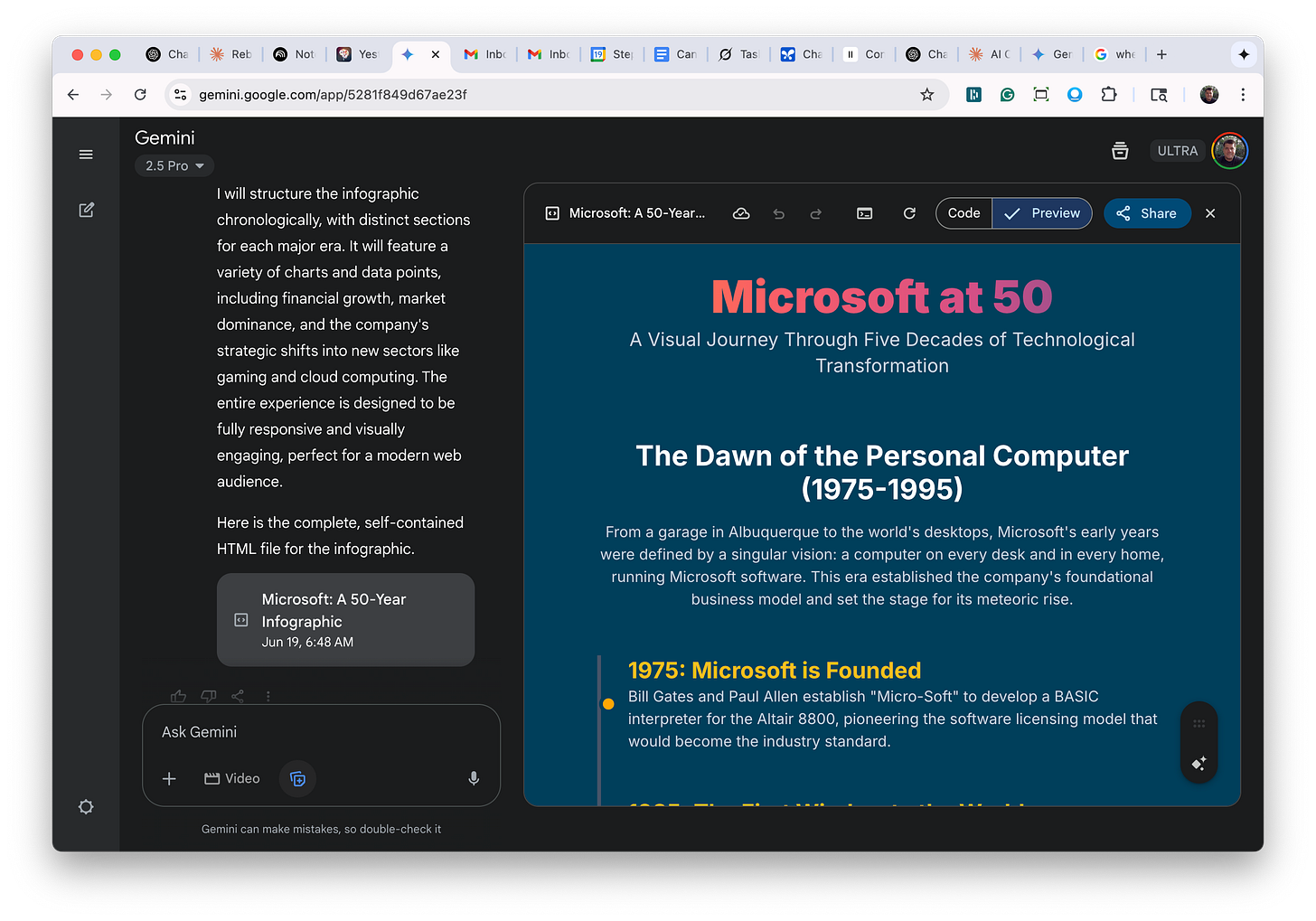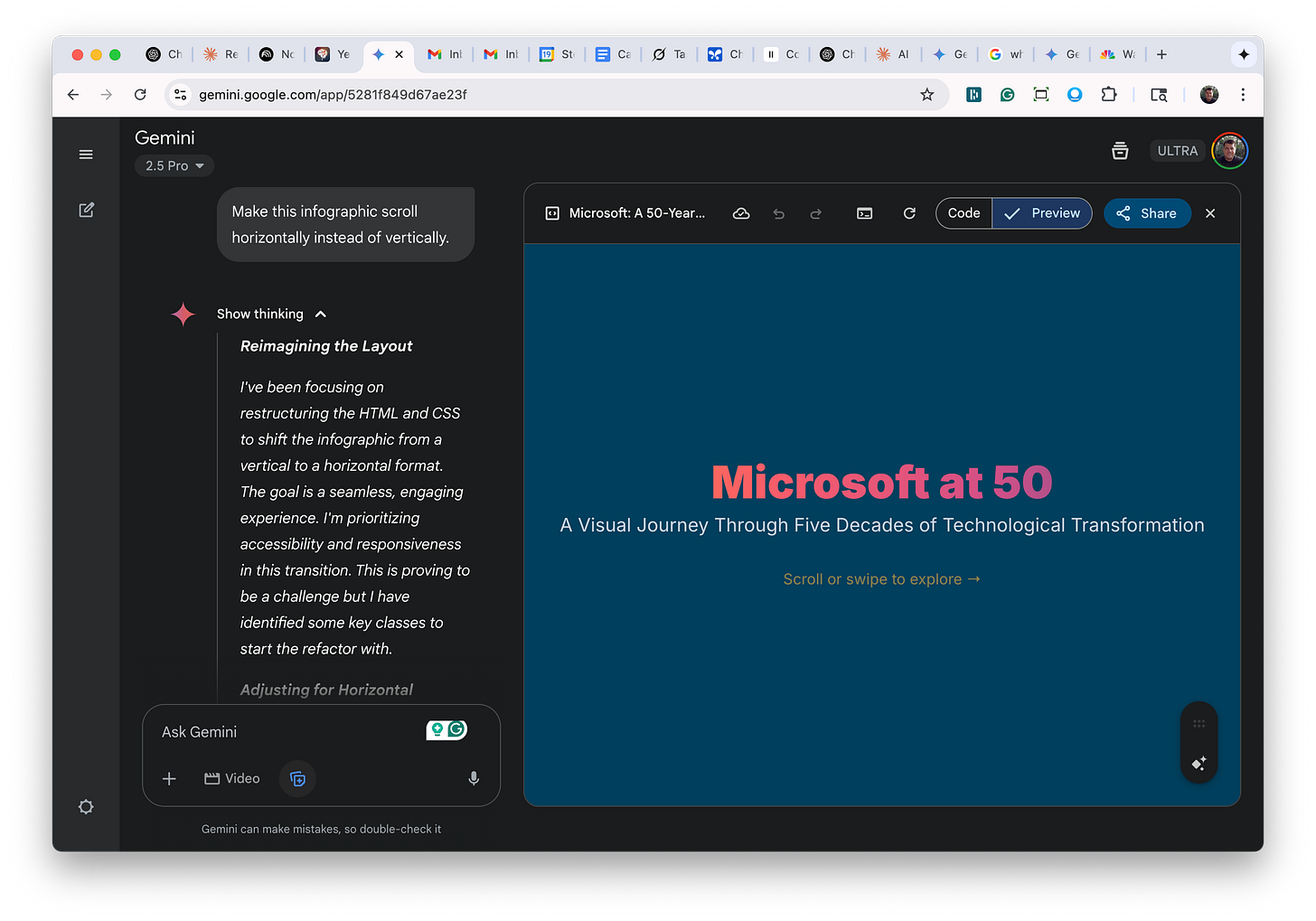 You can now scroll (vertically) through the timeline. If you hit the "share" button in the upper right, you can create a link to share with others, and they can open your timeline in their browser. You can also perform several other useful tasks. You can ask it to change the formatting. For example, maybe you want to apply a different colored background or change the font colors - just ask.