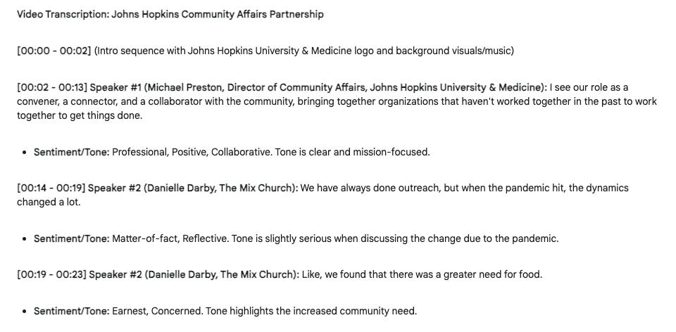 I uploaded a brief promotional video from Johns Hopkins and had it create a detailed transcription with timestamps and identify the speaker's emotional sentiment and tone. Here's an example of the output: