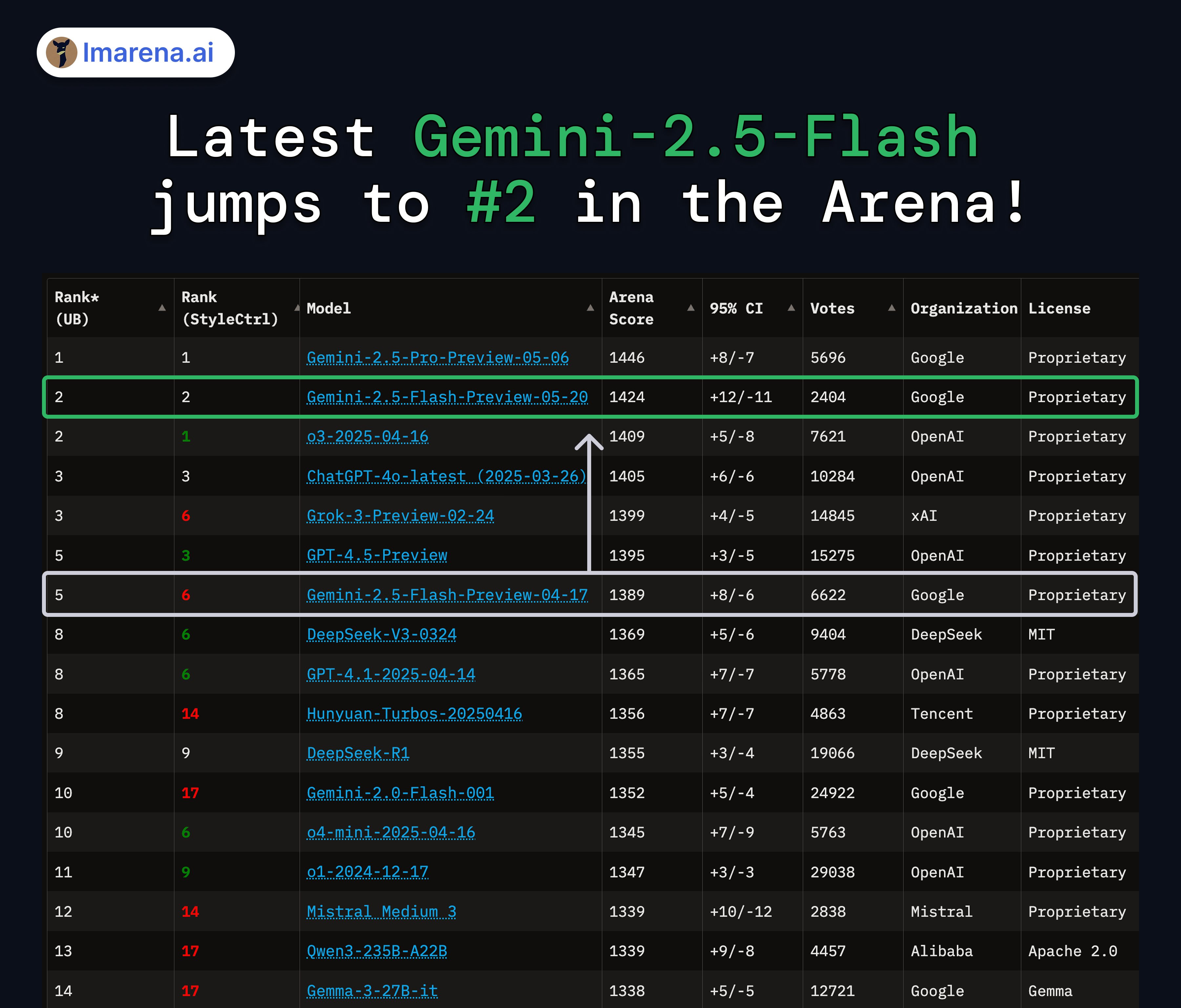 What impressed me most was how these two models complement each other, giving businesses the flexibility to deploy the right AI for each specific need rather than forcing a one-size-fits-all approach. The new Gemini 2.5 Flash has shockingly good performance. In fact, on LMArena it jumped five spots to take the #2 spot (just behind Gemini 2.5 Pro). Putting it ahead of the full OpenAI o3 model, ChatGPT 4o (latest), Grok 3, and even the ChatGPT 4.5 preview. Amazing for a flash model.