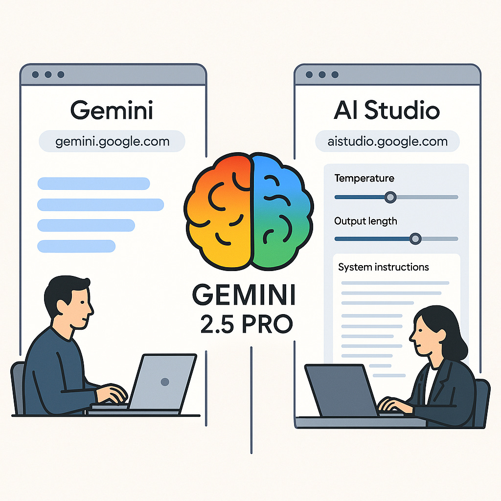 Think about it like this: both platforms use the exact same AI brain (Gemini 2.5 Pro). But the regular Gemini interface is like driving a car with automatic everything. You press the gas, and it goes. Simple.