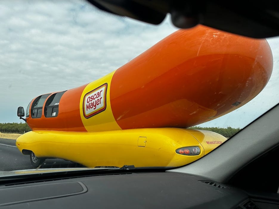 The image you sent me shows a hot dog shaped vehicle driving down a highway. This is a Wienermobile, a promotional vehicle used by the Oscar Mayer company to advertise its hot dogs. The Wienermobile is one of the most iconic and recognizable promotional vehicles in the world, and it has been delighting people of all ages for over 80 years.