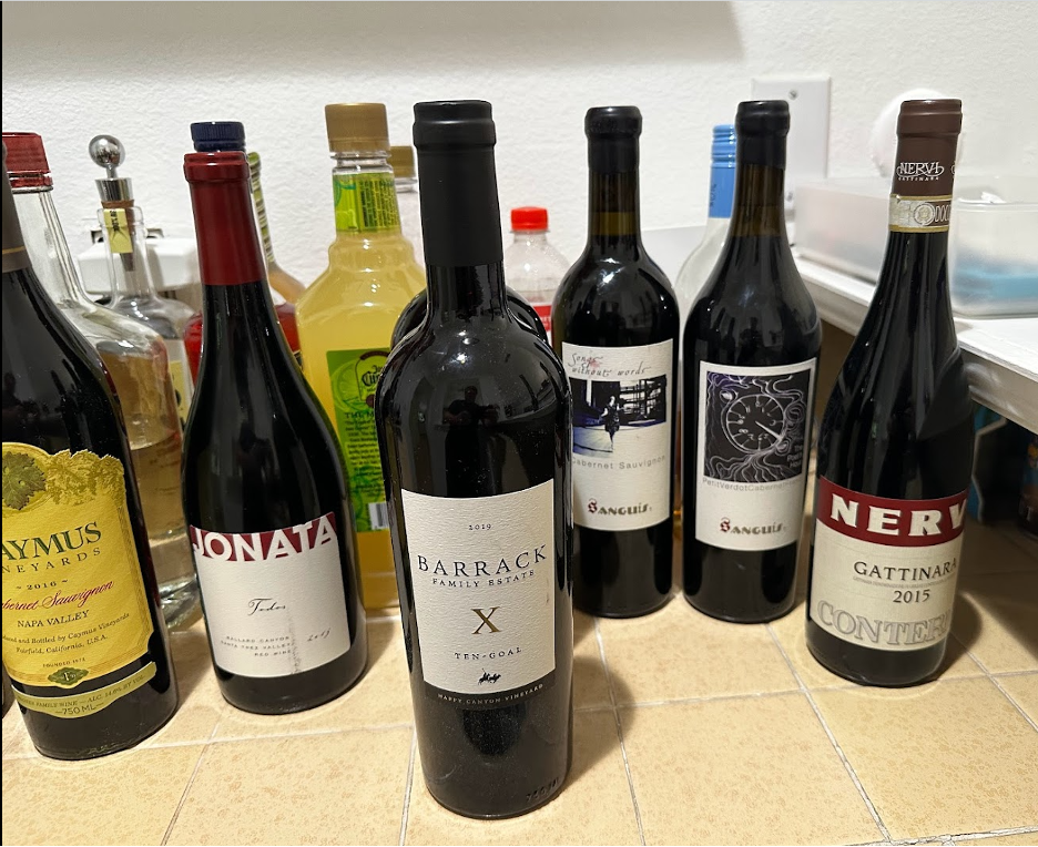 The image features a counter with a variety of wine bottles and liquor bottles lined up. There are at least nine wine bottles and one liquor bottle visible in the scene. The wine bottles are of different sizes and shapes, and they are arranged in a row. The liquor bottle is positioned slightly apart from the wine bottles.