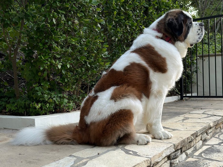 Dog Breed Identification: The dog appears to be a Saint Bernard based on its distinctive color pattern, size, and facial features.