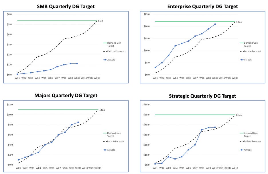 The power of doing something like this is you can see very early on (say week 2 or 3) if things are on track, and you can try and take course corrections early in the quarter. That’s what we did in this hypothetical strategic example in the bottom right – started off OK and then fell off so we would look at what actions we could take (engage channel partners, do a different SPIF with the BDR’s, etc) to get it back on track.
