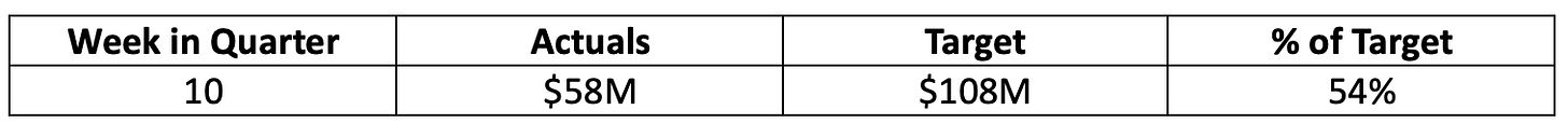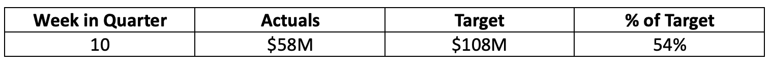 So, if you are in week 10 of a 13-week quarter (77% of the way through the quarter) and you are at 54% of the total target – is that a good thing or a bad thing? If that’s all of the data you really see – the answer honestly is “we don’t know.”
