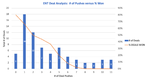 It was a little bit different with Enterprise deals. The complexity of those deals meant that more of those pushed more often and would still close – but we found that after four pushes our odds of closing started dropping pretty significantly (below 40%). At 7 pushes the odds of closing was low single digits (around 2%). So we made a rule that said anything more than 4-6 pushes we’ll forecast at a maximum of 20% and anything after that never made the forecast – it was pure upside if it came in.
