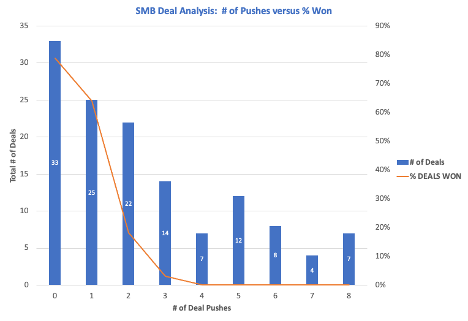 As we dug into the data – here’s what we found. There were a number of deals in both segments that kept pushing: 4,5,6,7,8,9+ times and the sales team refused to let the deals die. They wanted to keep them in the pipeline to show activity and coverage. Bet you’ve never seen that problem before in your sales org. 😉