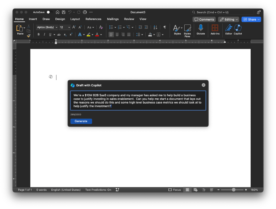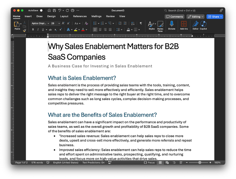 With even a simple prompt now, you can generate an incredible starting point to a new AI document. Let me give you two examples. Let’s say we start with this request: “We’re a $10M B2B SaaS company and my manager has asked me to help build a business case to justify investing in sales enablement. Can you help me start a document that lays out the reasons we should do this and some high-level business case metrics we should look at to help justify the investment?”