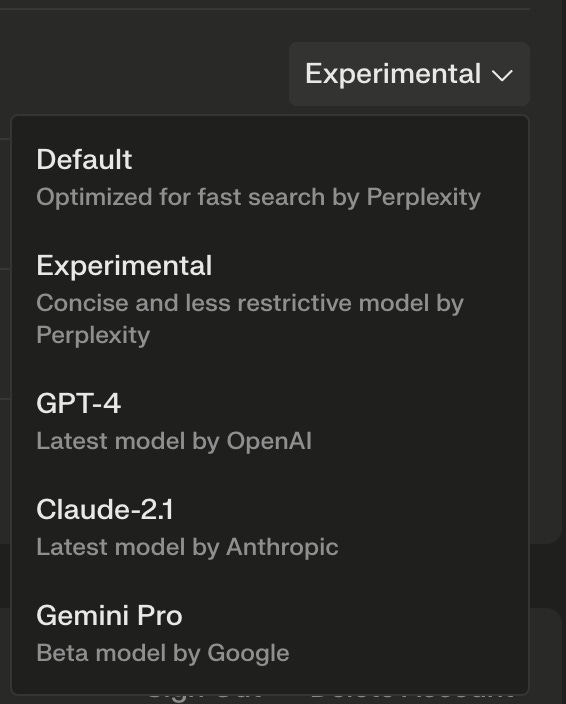 I subscribe to Perplexity Pro (again -- $20/month) – and one of the great things it allows you to do is change the underlying AI engine. You can access GPT 4, Claude 2.1, Gemini Pro and an experimental (even if you don’t subscribe to these) to answer your questions. If you use the default engine – the answers are SUPER fast. I’ve been spending most of my time in the experimental engine just to try it out (it all is super-fast and amazing).