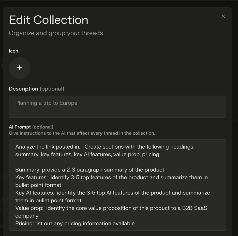 With Perplexity AI Collections – you can have their AI capability do a lot of the work for you. With a few simple instructions – you can create a custom collection that takes a URL as input and provides you with the following types of data: summary of the product, key features, key AI features, value proposition and pricing (if available).