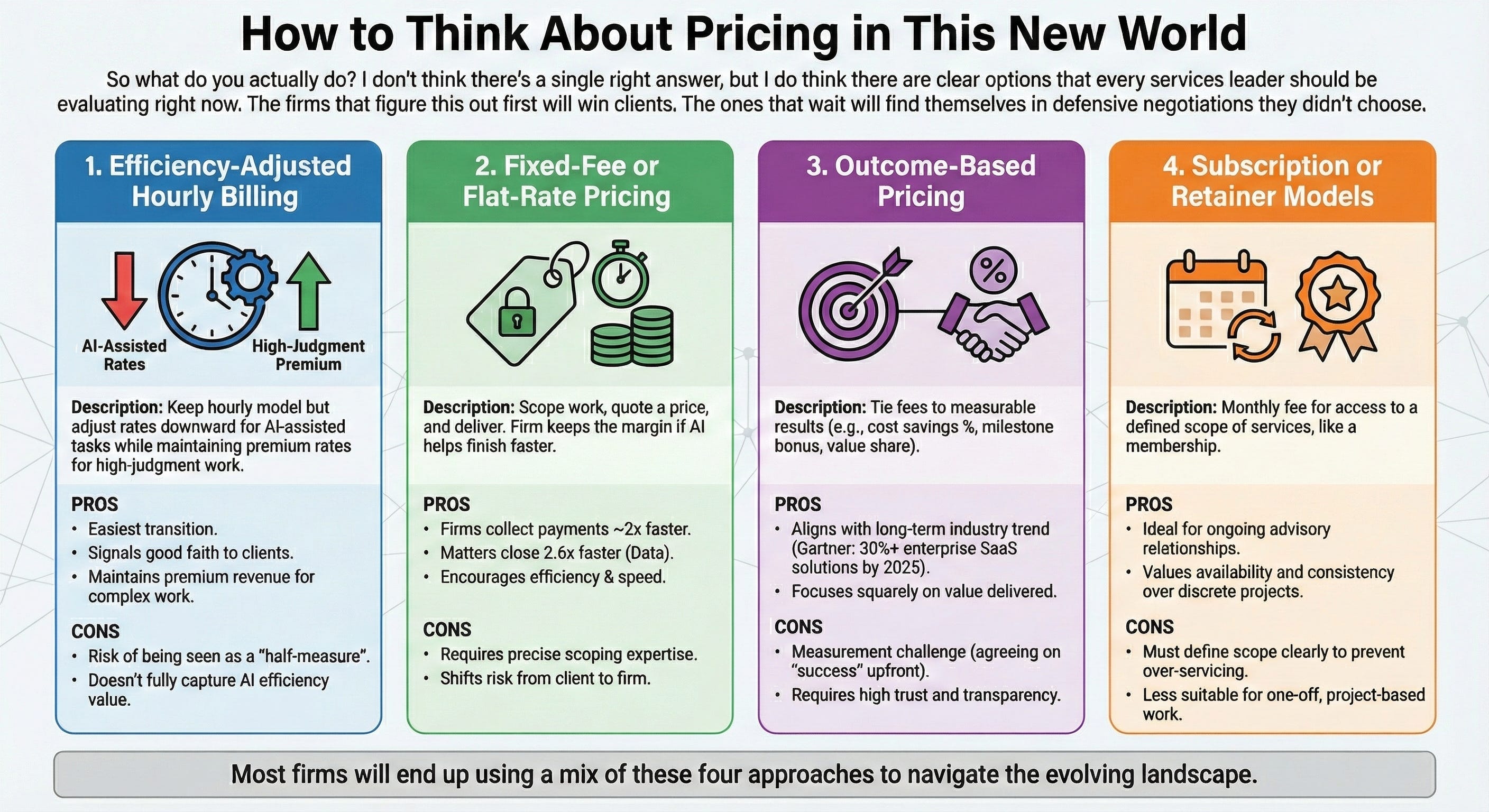 Here’s how I’d think about it. There are really four pricing approaches emerging, and most firms will end up using a mix.
