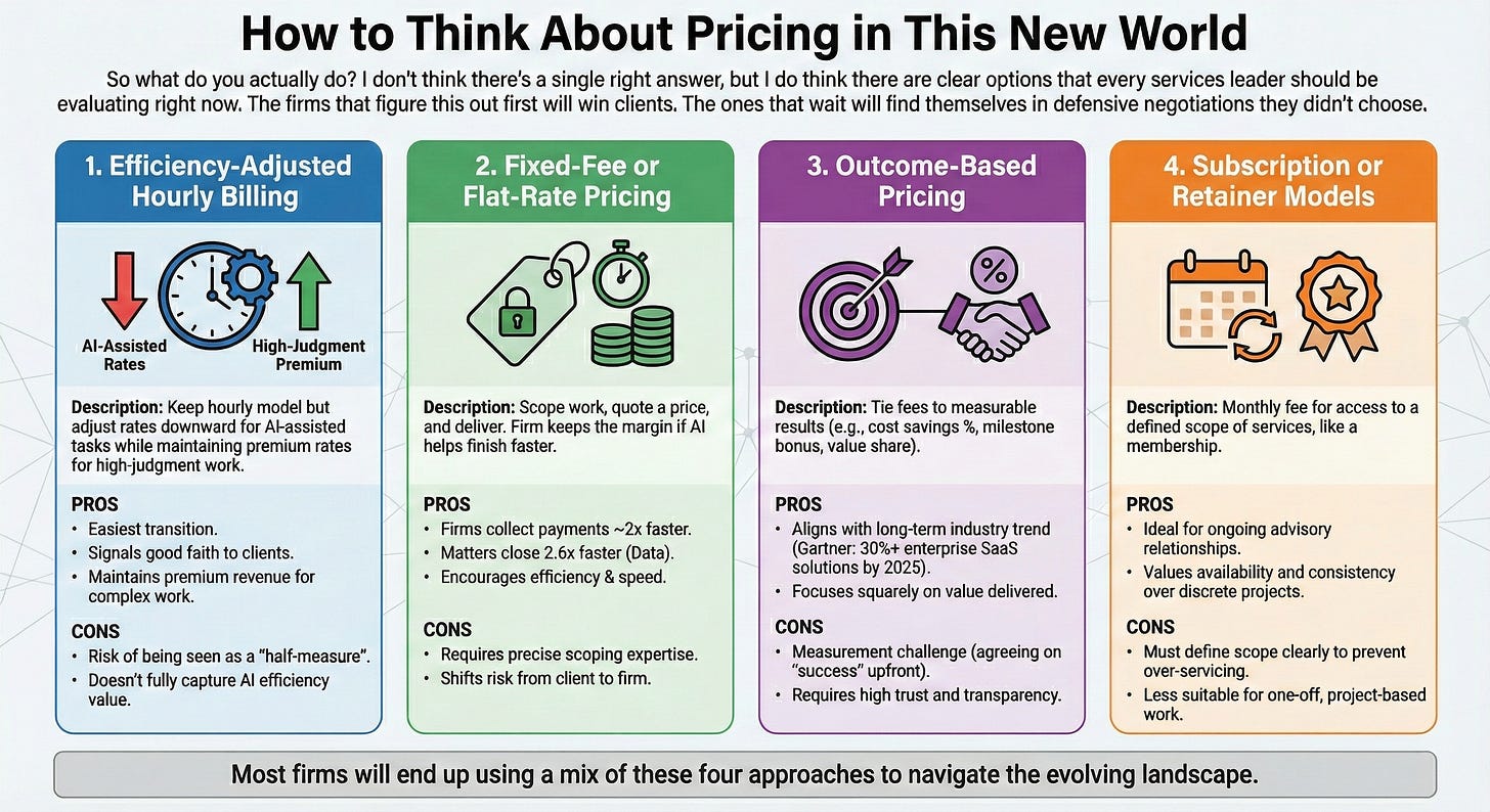 So what do you actually do? I don’t think there’s a single right answer, but I do think there are clear options that every services leader should be evaluating right now. The firms that figure this out first will win clients. The ones that wait will find themselves in defensive negotiations they didn’t choose.