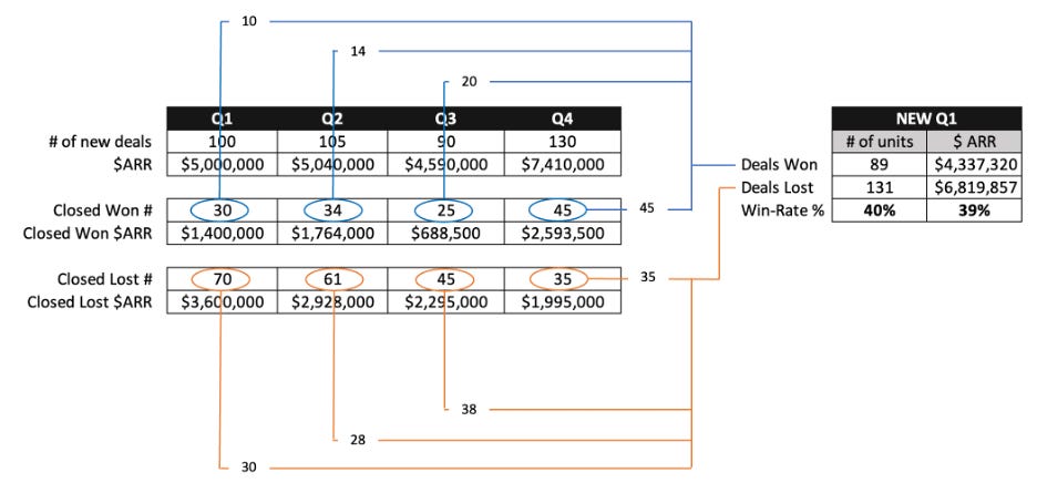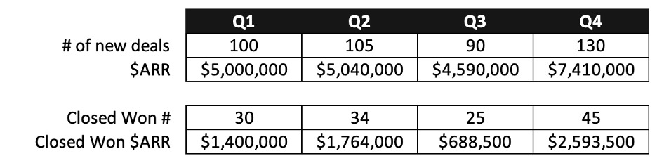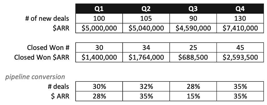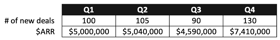 Let’s say that a company has been creating new pipeline per quarter like the table below (# of new deals and $ARR associated with those deals):