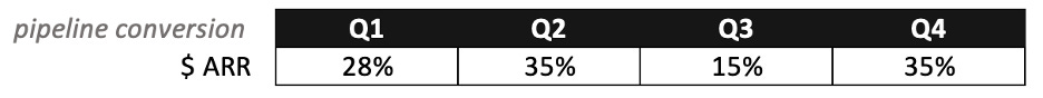 So I want to call out an important point here – it’s important to look at pipeline conversion in both # of deals and in $ARR – but the $ARR conversion rate is more important because you use it for forecasting purposes and digging in to it gives you a better sense of your business. You’ll notice that in most quarters the numbers in this example are fairly close which is a good thing – but in Q3 there was a divergence. The ARR % closed was significantly lower than other quarters. 15% versus compared to other quarters where the average is around 33%. Something happened that quarter and you’ll want to find out why. Did only small deals close? Did the type of deals change? Did the source of the deals change? These are important questions to go look at when you look at pipeline conversion this way.