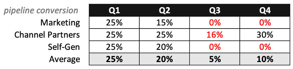 Something clearly shifted in Q3 in marketing and self-gen. Given that Q3 was weak across all segments – there may be something more macro going on there – but you need to drill in like this to start to identify what the problem really is. Clearly the fact that we had 0% conversion on marketing and self-gen pipeline for two quarters in a row would be a major red flag. Did we change something in the qualification process? Did we get new sources of leads? Have we turned over the majority of the sales staff? We need to find out what’s happening – but that’s a challenge for another day.