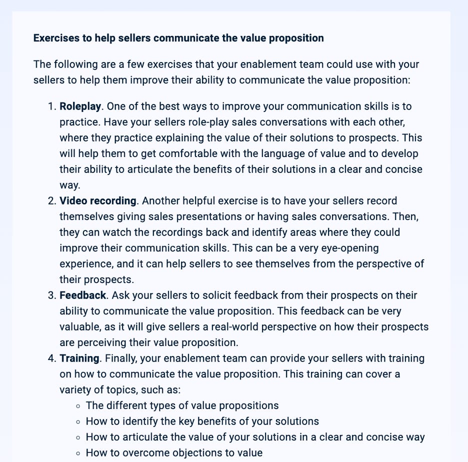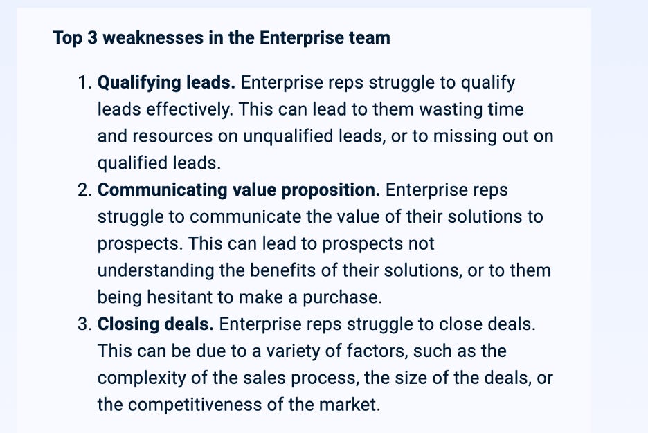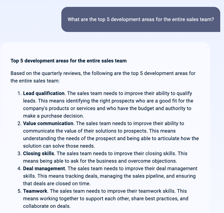 This is very much in line with what my enablement leader would have recommended. I decided to add one more question to the mix: what are the top 5 development areas for the entire sales team?