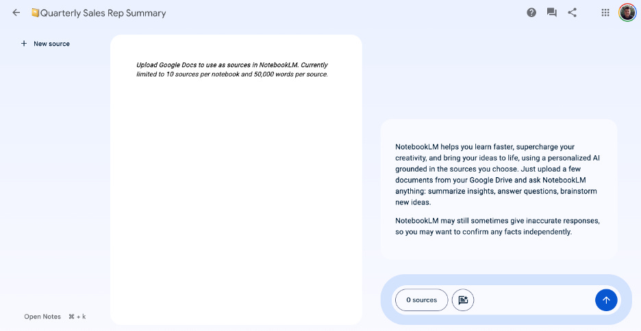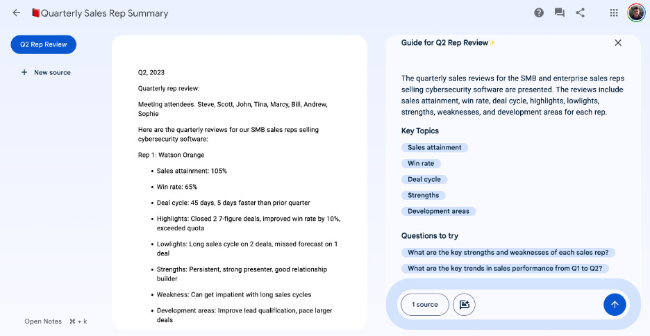 Basic performance statistics, quarterly highlights and lowlights, overall strengths and weaknesses, and finally, development areas. It’s a significant effort to review every rep and come up with a solid action plan at the end. For purposes of testing out NotebookLM, I created a complete set of demo information on 10 SMB reps and 10 enterprise reps. Let’s look and see what Google’s new NotebookLM tool looks like and how it can help!