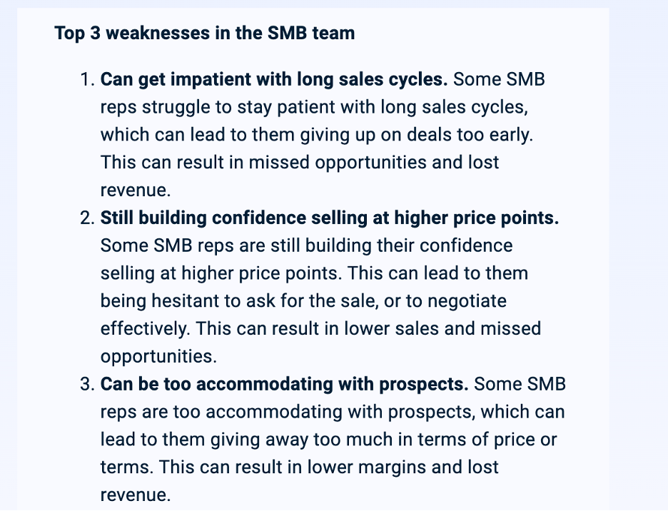 That’s exactly right. Now, let’s focus on some more of the exciting data. I care deeply about weaknesses and development areas – because those are things that I want to build action plans around. I asked for the top three weaknesses of the SMB team and the top three weaknesses of the enterprise team. Here are the results:
