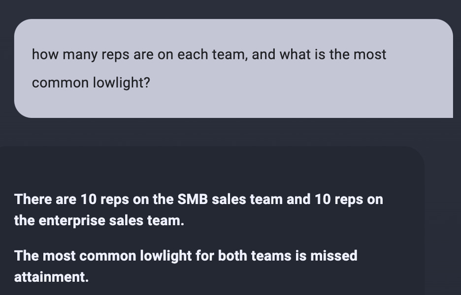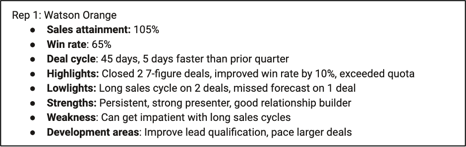 Imagine a scenario where you’ve just finished the quarter, and you are reviewing the progress of each rep. You have 100 SMB reps, and you have 40 enterprise reps – consolidating that info and extracting key insights is a significant effort. You ask your leaders to prepare insights for every sales rep in a structure that looks like the following:
