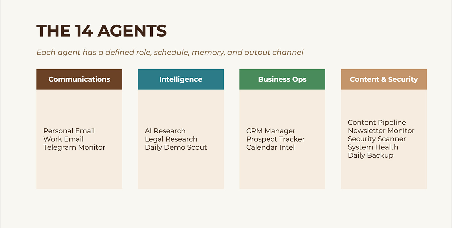 The agents fall into four groups. Communications agents handle personal email, work email, and Telegram monitoring. Intelligence agents run AI research, legal research, and a daily demo scout. Business ops agents manage CRM activity, track prospects, and pull calendar intelligence. Then there’s a content and security layer covering the content pipeline, newsletter monitoring, security scanning, system health, and daily backups.