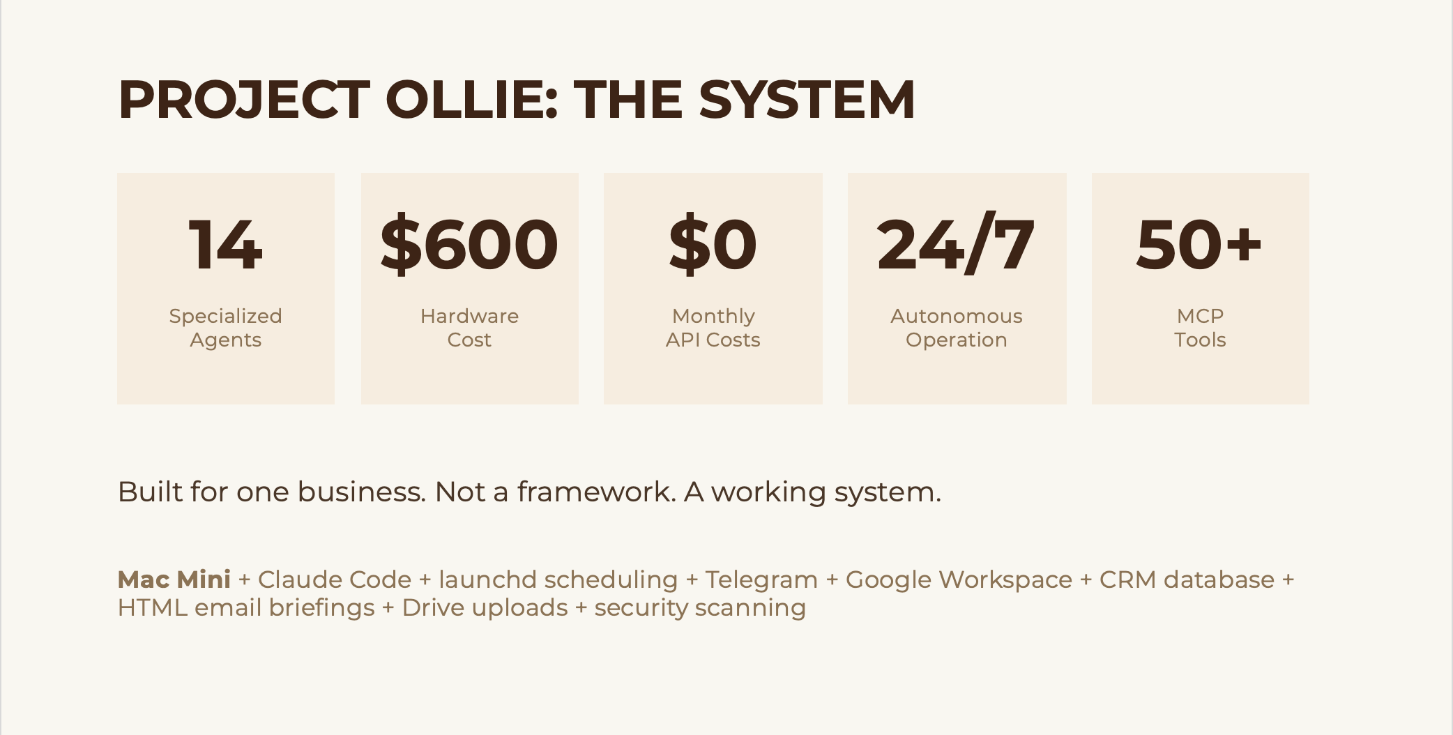 TL;DR: I started with OpenClaw, an open-source personal AI agent system. It proved the concept, but it wasn’t ready for real business use. So I rebuilt everything on Claude Code with Anthropic’s Opus 4.6. The result is Project Ollie: 14 specialized AI agents running on a $600 Mac Mini that monitor email, track CRM activity, generate intelligence briefings, and deliver executive summaries to my phone before I wake up. What mattered most wasn’t the demo. It was figuring out what I could actually trust with real work.