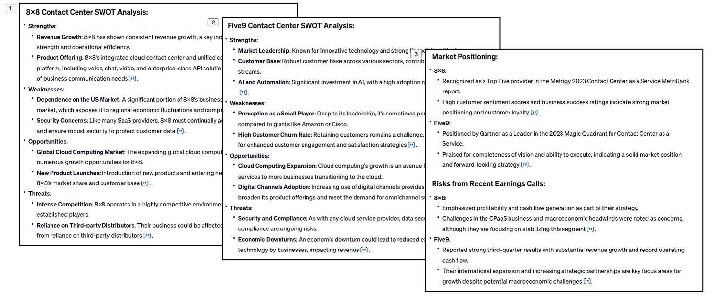 “Please do a detailed competitive analysis of 8x8's contact center offering in comparison to Five9's contact center offering. Do a full SWOT breakdown of each product. Discuss market positioning and any risks to their business models from recent earnings calls.”