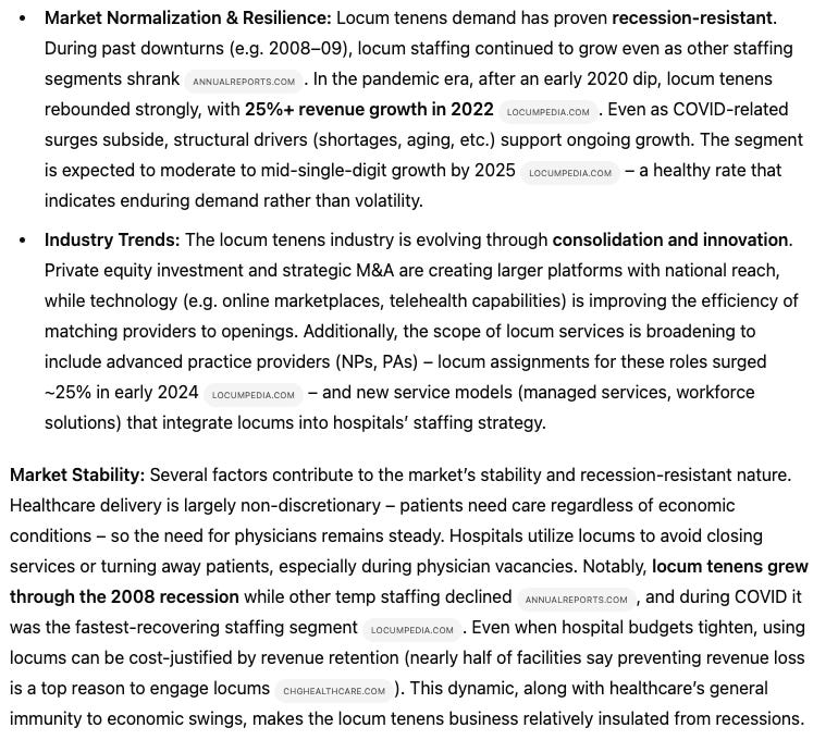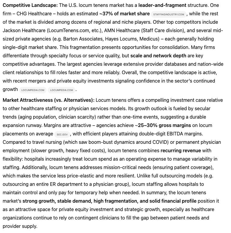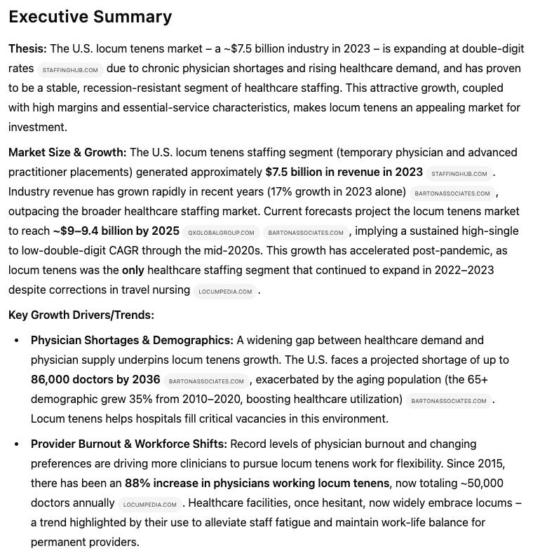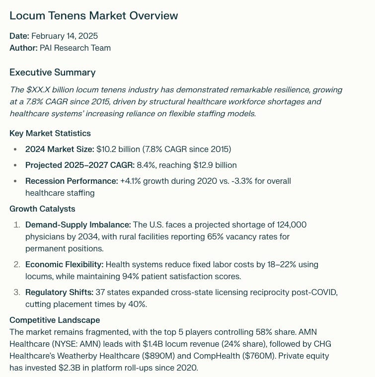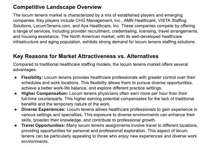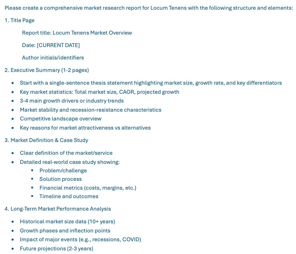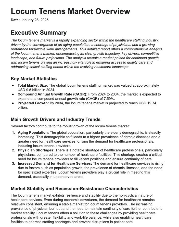 Consider the first challenge: analyzing the locum tenens healthcare staffing market, which typically keeps consulting firms busy for weeks.