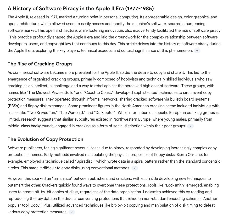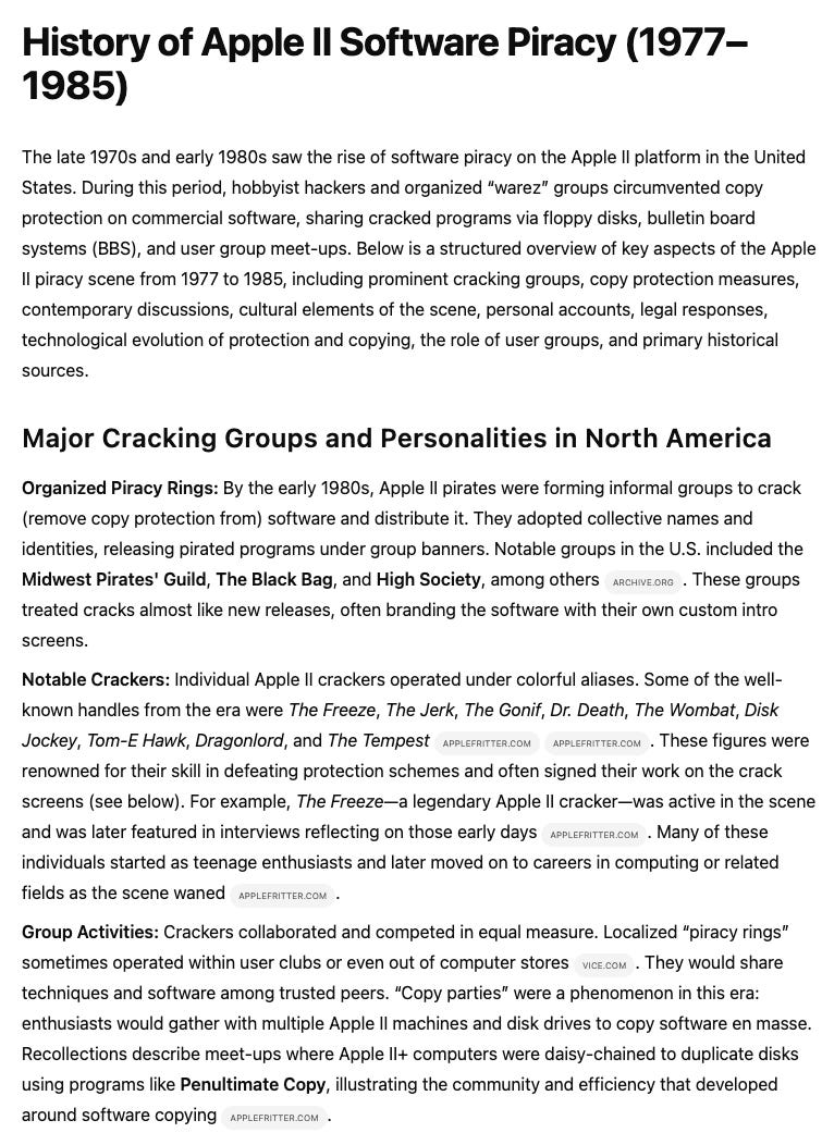 For my second test, I chose a topic close to home: the Apple II software piracy scene of the 1980s. Having known many of the key players personally, I could fact-check the AI's historical detective work. Here, the gaps between platforms became even more telling. While OpenAI wove together a largely accurate narrative from 41 sources, Perplexity's account included several phantom details – including an entirely fictional group called the "Apple Mafia" that dissolved upon further questioning. It also identified the group “Black Bag” as being European when it was US-based organization.
