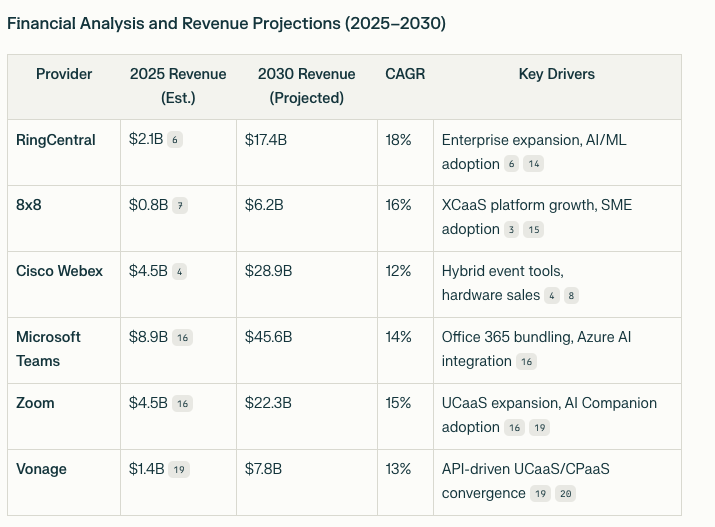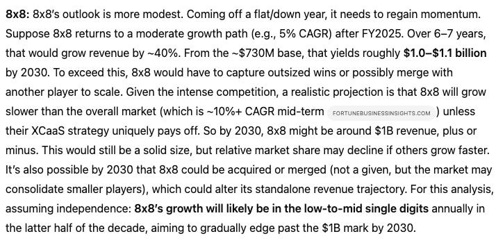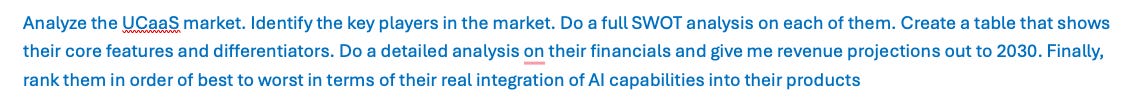 The real stress test came with my third request for an analysis of the UCaaS (Unified Communications as a Service) market, an industry I've tracked for many years. OpenAI again demonstrated impressive analytical rigor, while Gemini's optimism got the better of it – projecting implausible growth rates for struggling companies. But it was Perplexity's response that truly illustrated the dangers of AI-powered research gone wrong. Its projection of 8x growth with a 16% CAGR for a major player wasn't just optimistic – it was mathematically impossible.