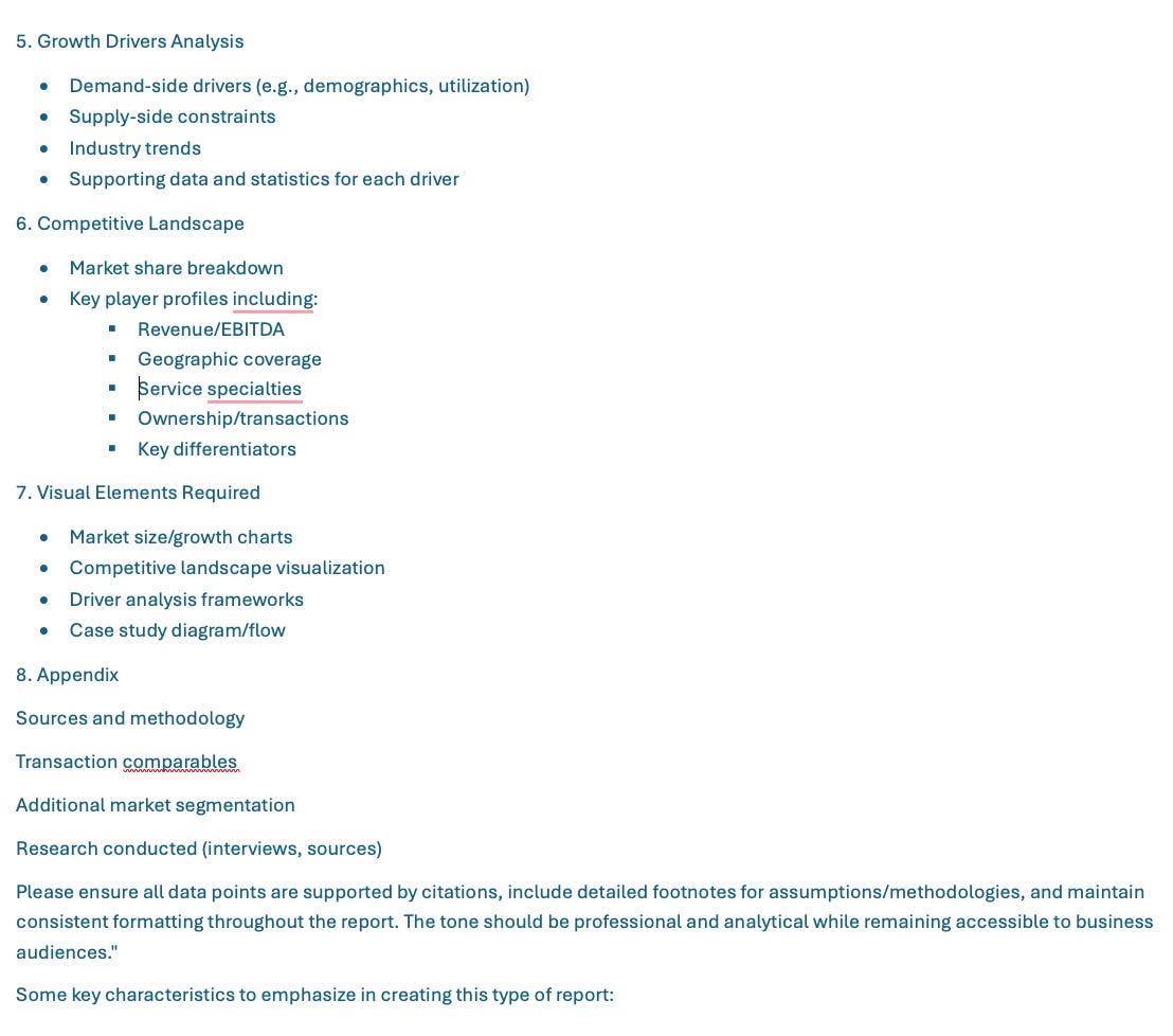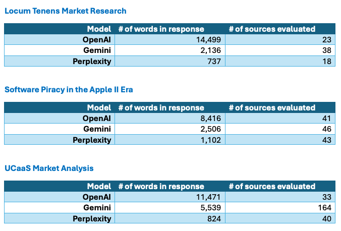 OpenAI's response was remarkable – a 14,499-word analysis drawing from 23 sources that could have passed for a junior consultant's first draft. Gemini offered a more modest but still substantive 2,136 words backed by 38 sources. Despite its recent headlines, Perplexity delivered just 737 words and raised immediate red flags with questionable market size figures.