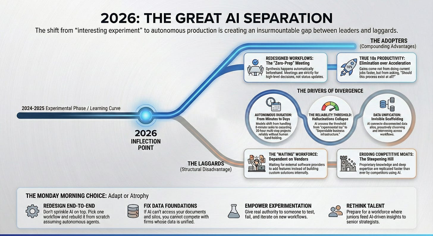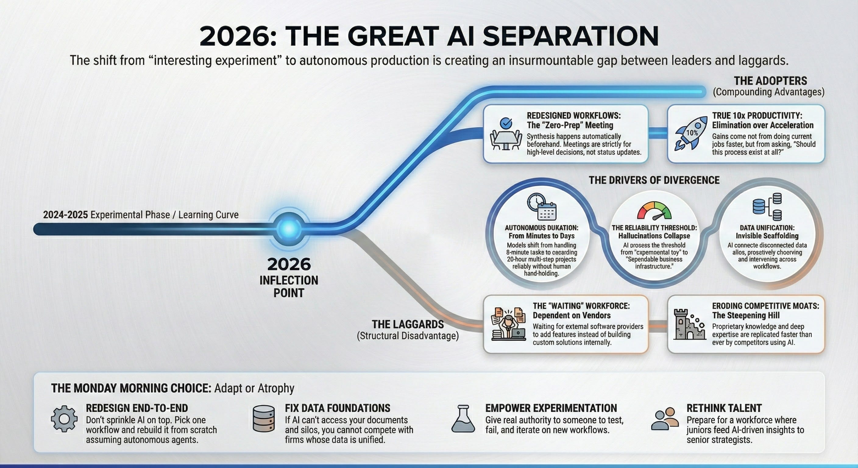 2026 is a decisive year. Models will get meaningfully more capable. Adoption will separate into leaders and laggards. The compound advantages for early movers will become more difficult to overcome.