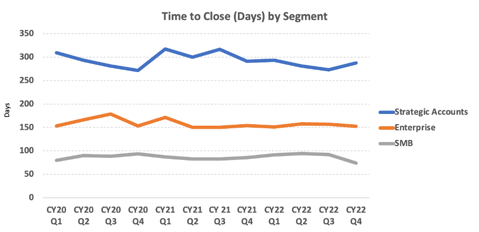 So let’s look at an organization that has three sales segments – SMB, enterprise and strategic accounts and see what’s been happening to time to close in the past few years. Typically, you measure time to close from the moment a deal enters pipeline to the moment it ends up as closed won business. You should certainly be measuring the time it takes a deal to get into the pipeline (how time in MQL, SAL, etc.) – but that’s for a different discussion.