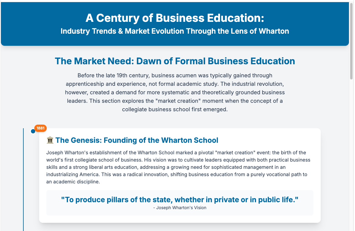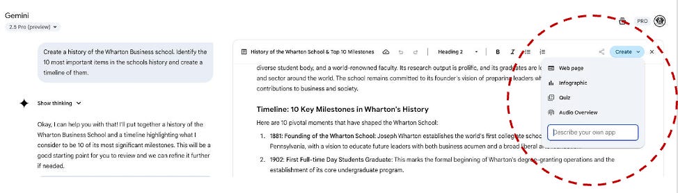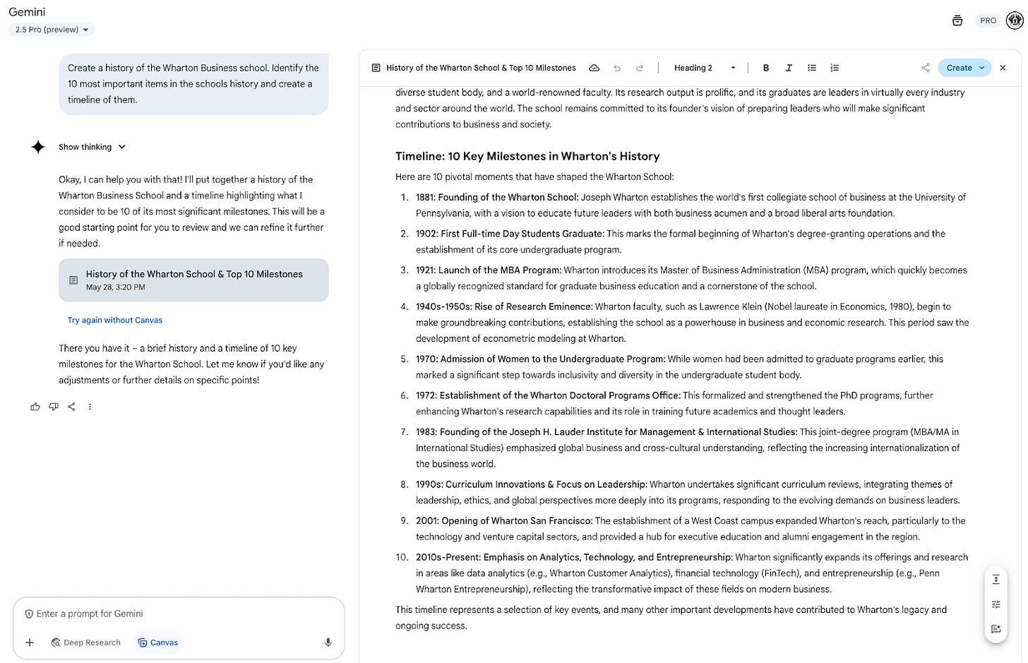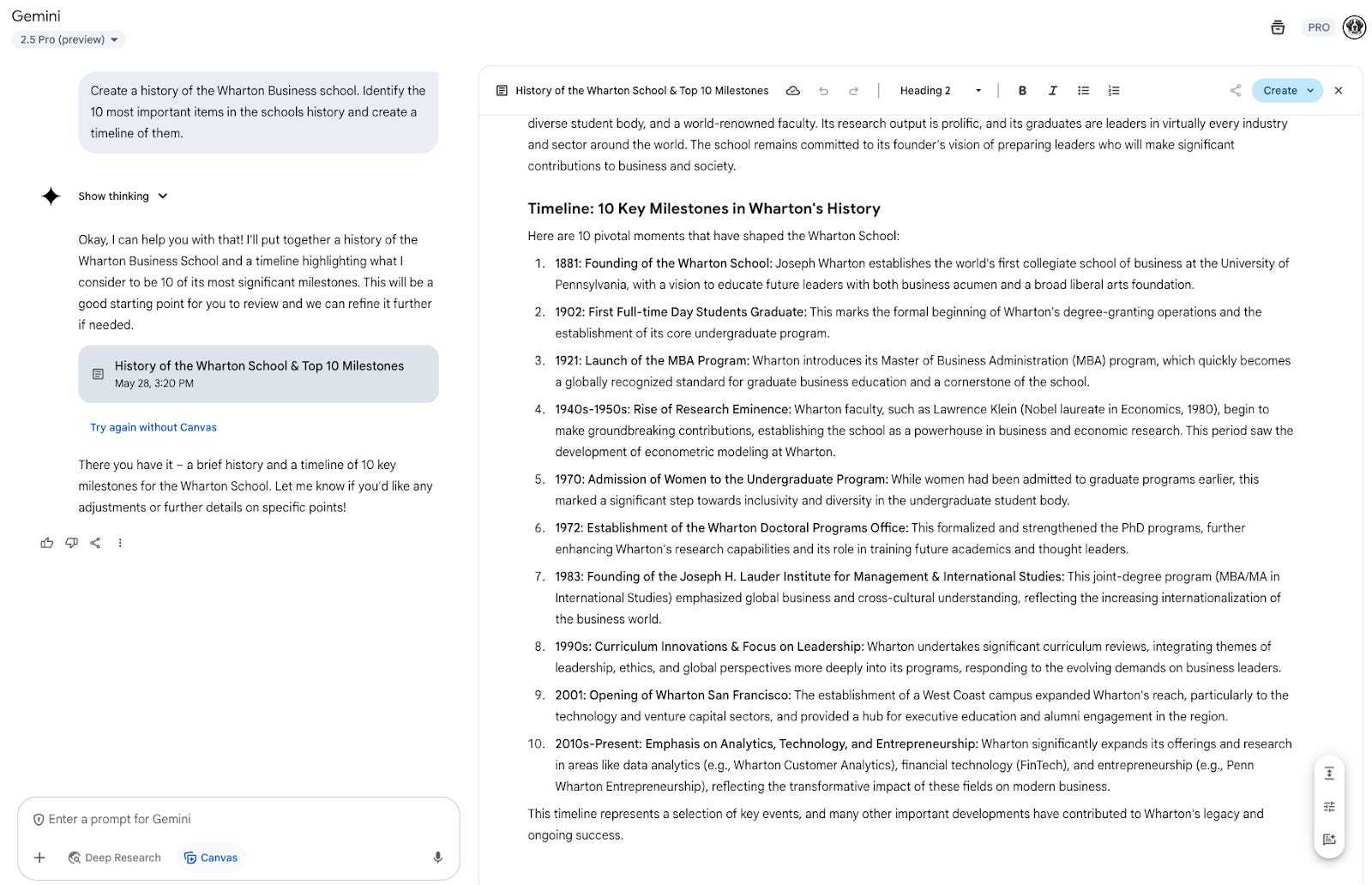 Here’s an example: I started with a prompt to create a new document in Canvas, “Create a history of the Wharton Business School. Identify the 10 most important items in the school’s history and create a timeline of them.”