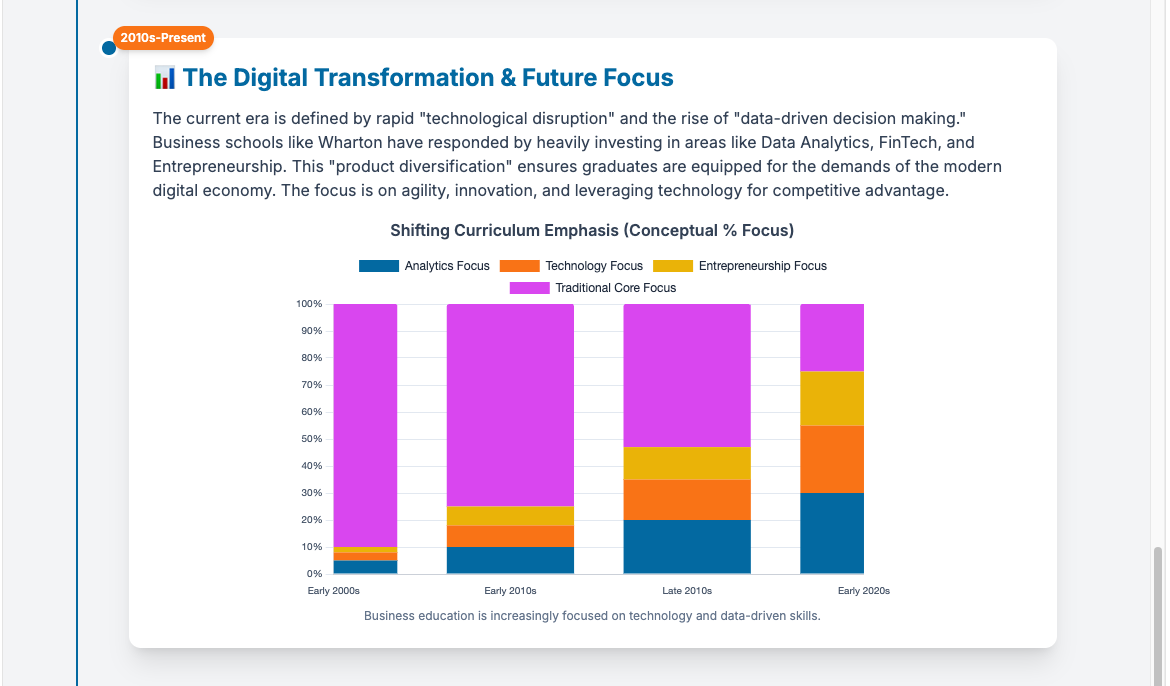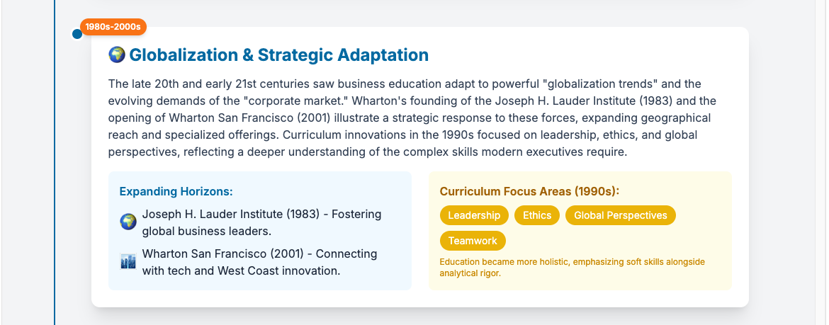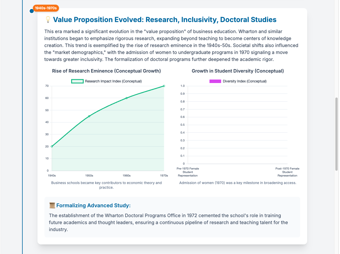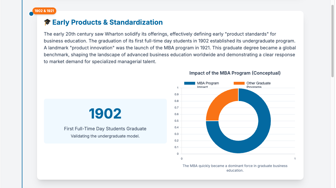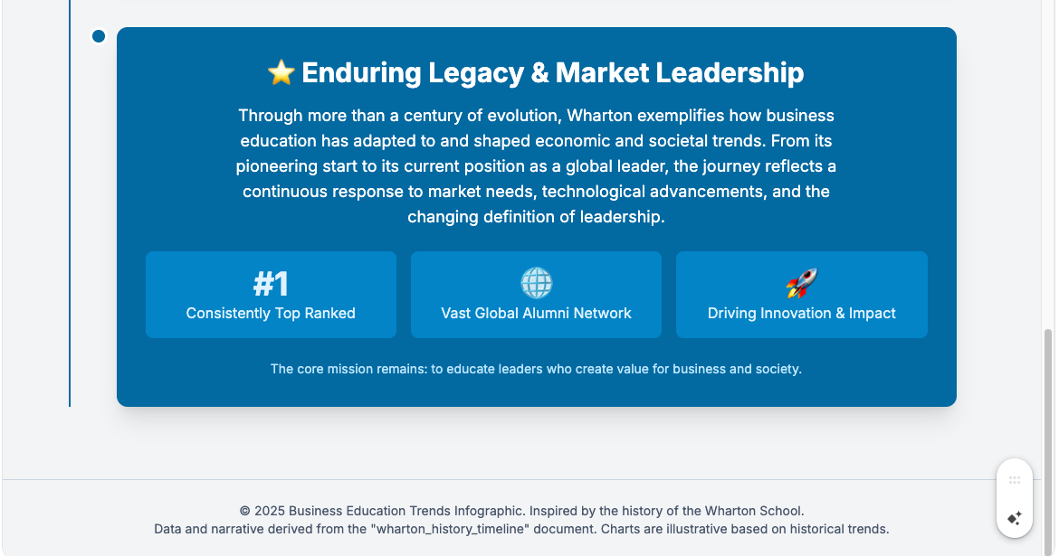 Here’s an example: I started with a prompt to create a new document in Canvas, “Create a history of the Wharton Business School. Identify the 10 most important items in the school’s history and create a timeline of them.”