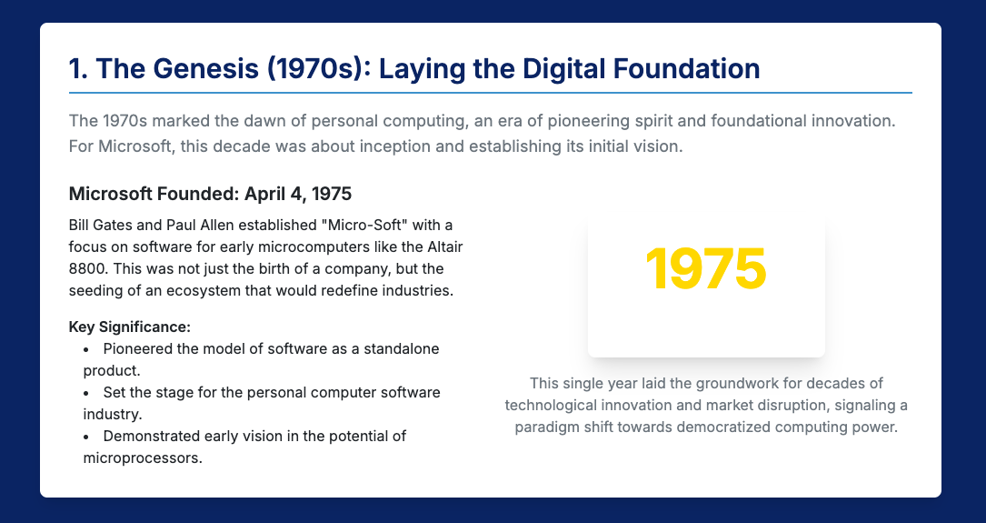 The infographic creator particularly caught my attention. I needed to visualize the evolution of Microsoft for a recent research piece. Instead of spending days briefing a designer, iterating through drafts, and managing revisions, I described what I wanted. The canvas infographic function transformed my rough ideas into a polished, interactive timeline that my audience engaged with. The same happened when I mapped out the history of major AI breakthroughs. What would have taken weeks and thousands of dollars took me less than an hour.