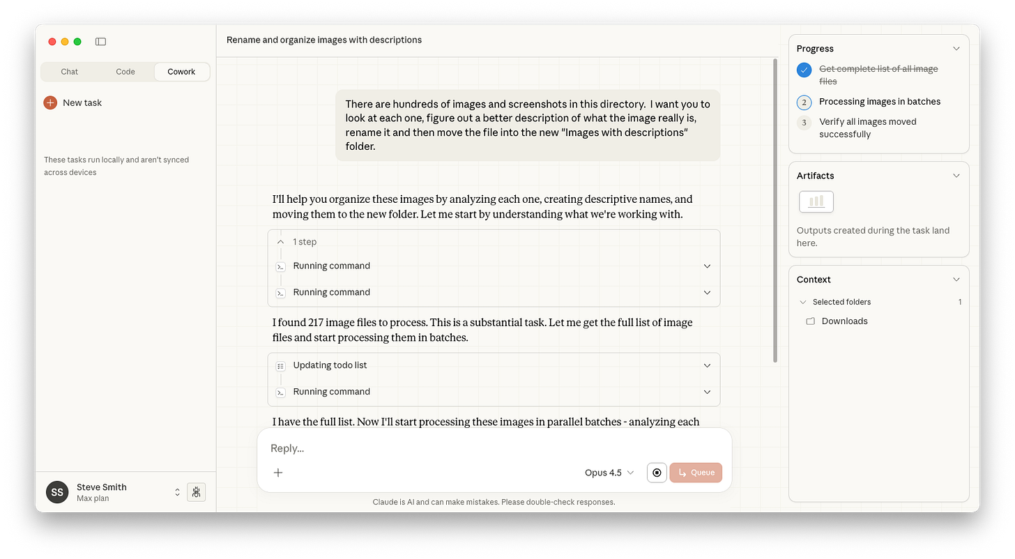 Here’s a perfect example that I just ran. I have hundreds of images and screenshots in my downloads directory, and they have names like “gemini_generated_image_q3jcs…..” I have no idea what they are. So I kicked off Claude Cowork with the following command “There are hundreds of images and screenshots in this directory. I want you to look at each one, figure out a better description of what the image really is, rename it and then move the file into the new "Images with descriptions" folder.” It’s now going through every image and giving each a much better, more descriptive name (like “data-governance-bridge-blueprint-illustration.png”)